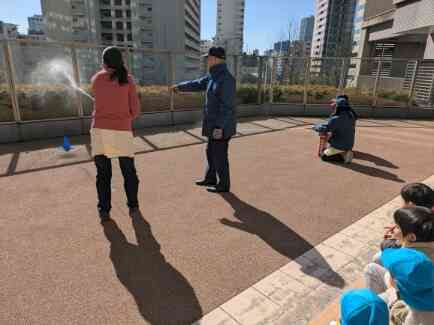 園庭で消火訓練をしました。消火器の使い方を丁寧に教えていただき、先生たちが初期消火に挑戦。