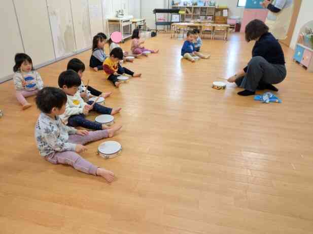 リトミックの先生からタンバリンと太鼓のばちを貸していただき、歌に合わせてみんなで叩いてリズムを取ります。