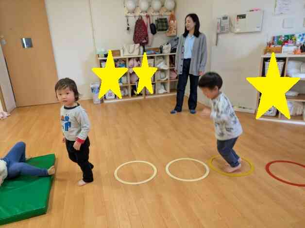うさぎ組(2歳児)のお友だちも、フラフープをジャンプしたり、マットの上をゴロゴロ転がったりと、全身を動かしながら楽しんでいます!