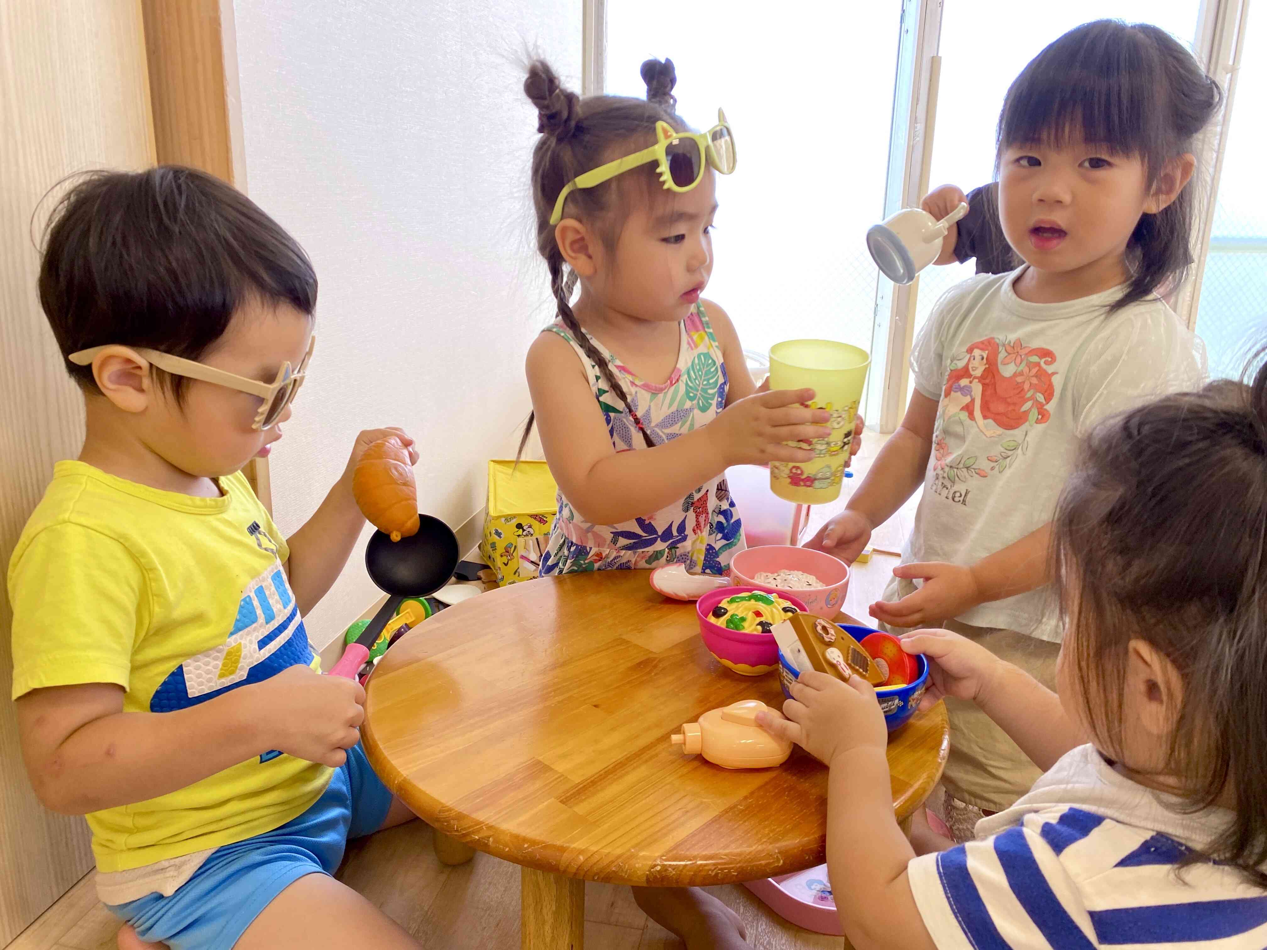 ままごとコーナーでは、お皿に食べ物を乗せて「どうぞ〜♪」とごちそうをふるまったり、お友だちといっしょにキッチンでお料理をしたりと、