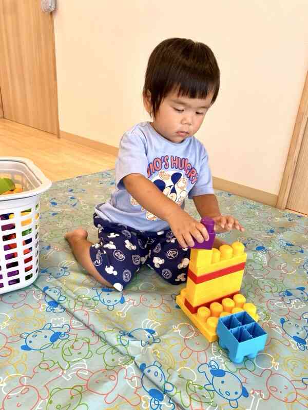 ブロック遊びでは、まだ何かを作り上げるというよりも、ブロックをつなげたり外したりすること自体を楽しむ姿が見られました。