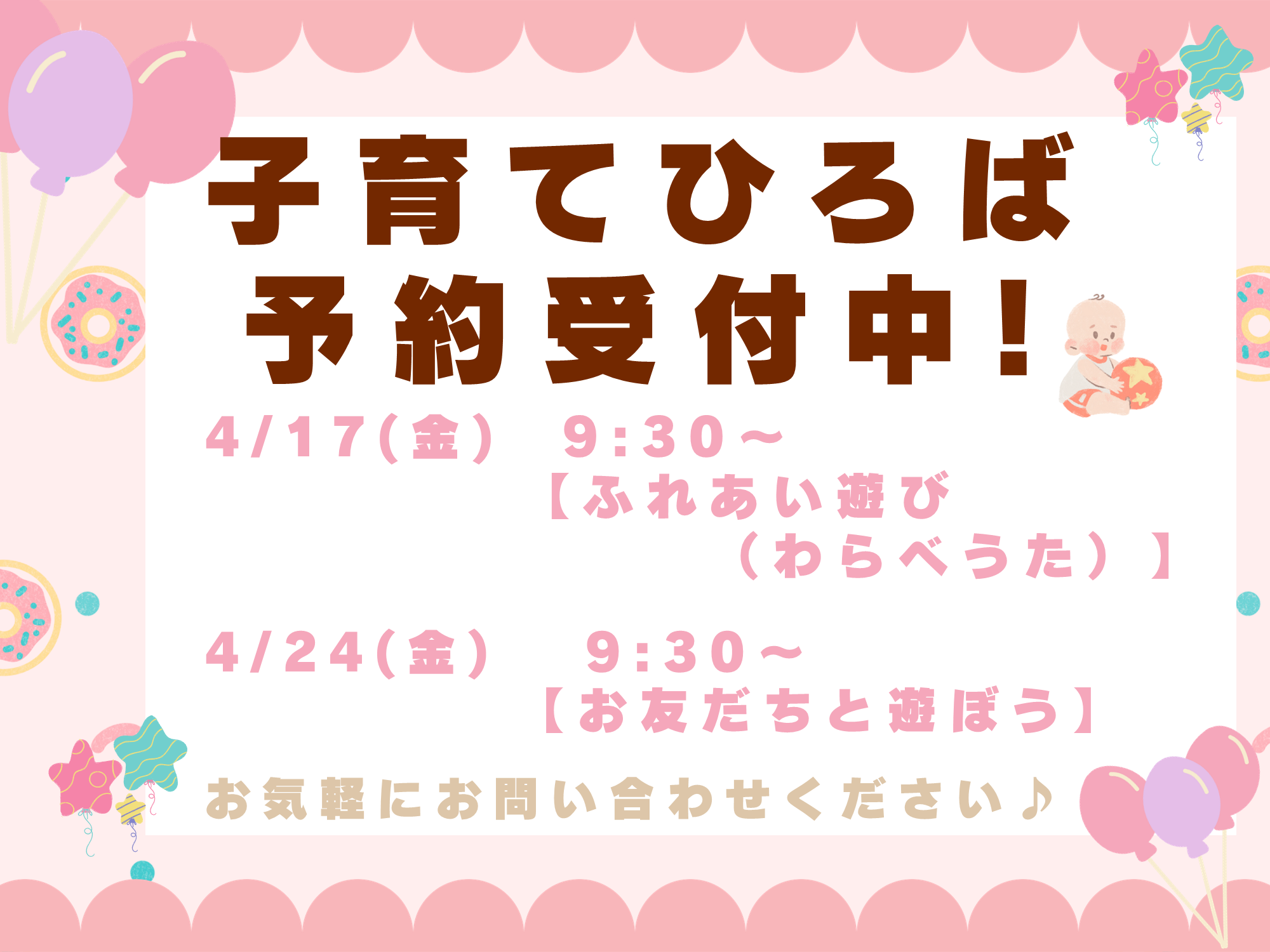子育てひろば・園見学を開催しています。ご予約は、お電話もしくはホームページ「園見学予約」「子育てひろば」からお気軽にご連絡ください。お待ちしております。