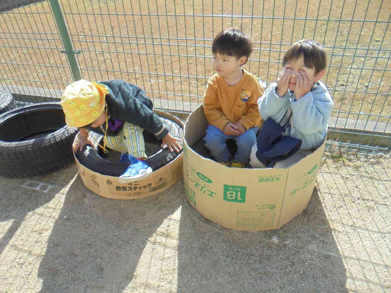 立春を迎え、日差しにぬくもりを感じるようになり、子どもたちは元気に戸外で遊んでいます。お庭のタイヤがお気に入りで、中に入ったり、タイヤ渡りをして遊んでいます。