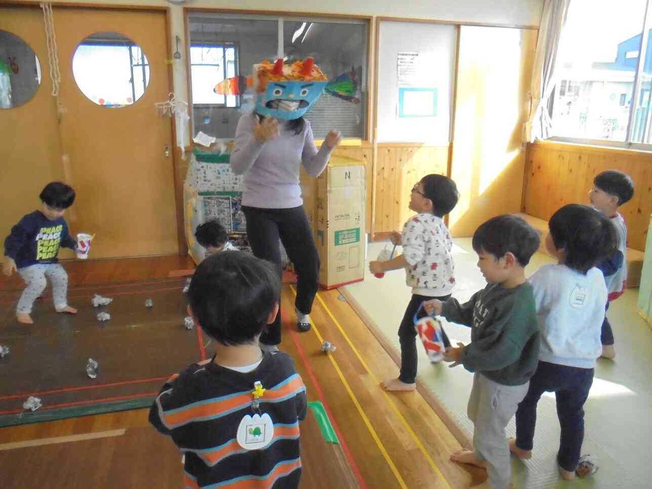 優し~い鬼さんが保育園に遊びに来たので、子どもたちはびっくりするものの興味津々。