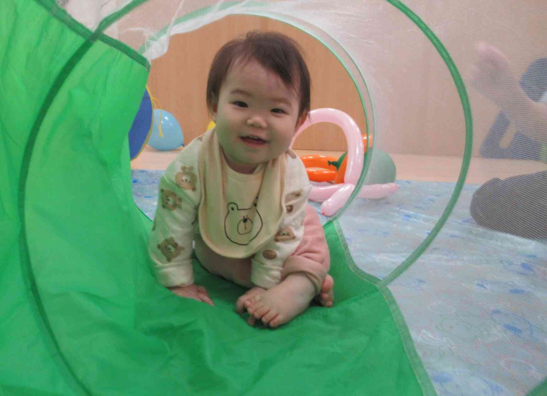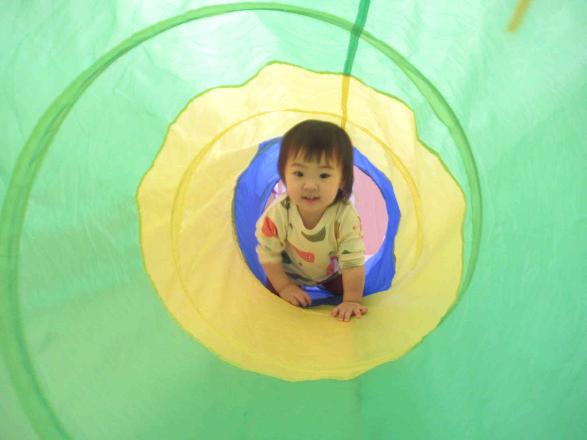 しばらくトンネルの中で座り、トンネルの外にいるお友だちや先生に手を振っていました。