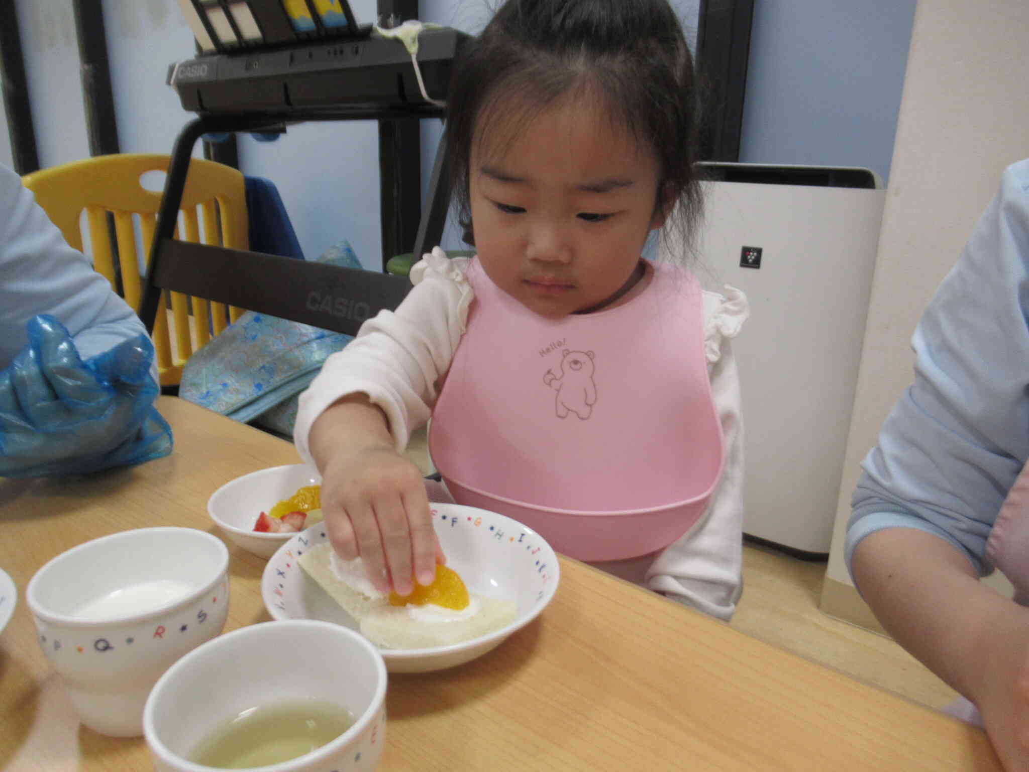 クリームがのせてあるパンの上に好きなフルーツをのせます。