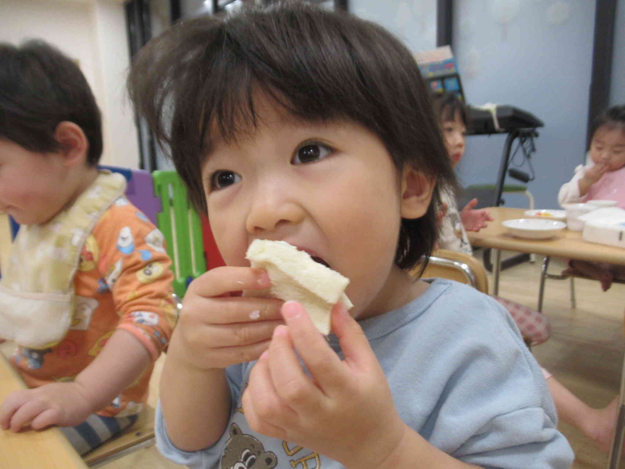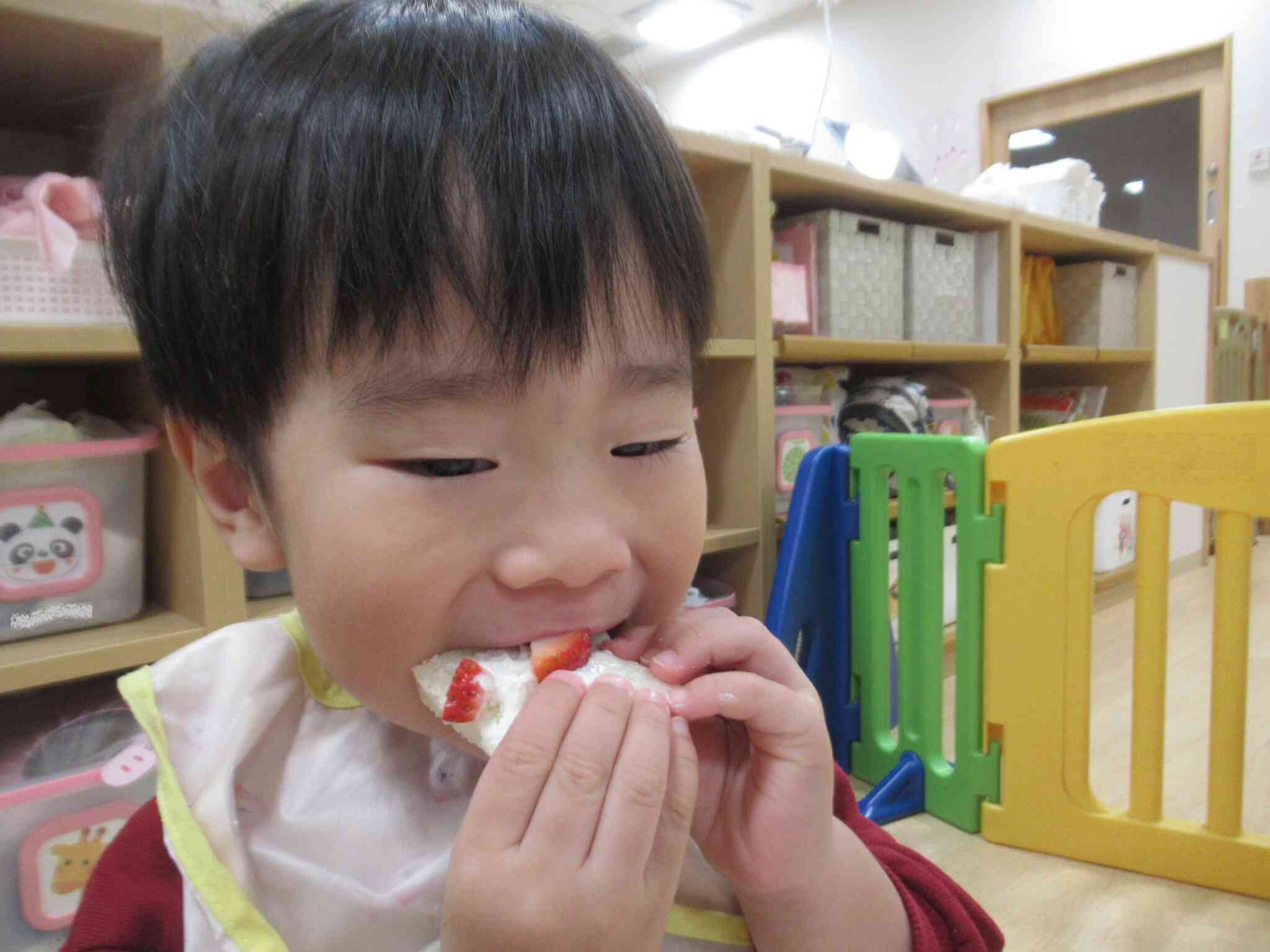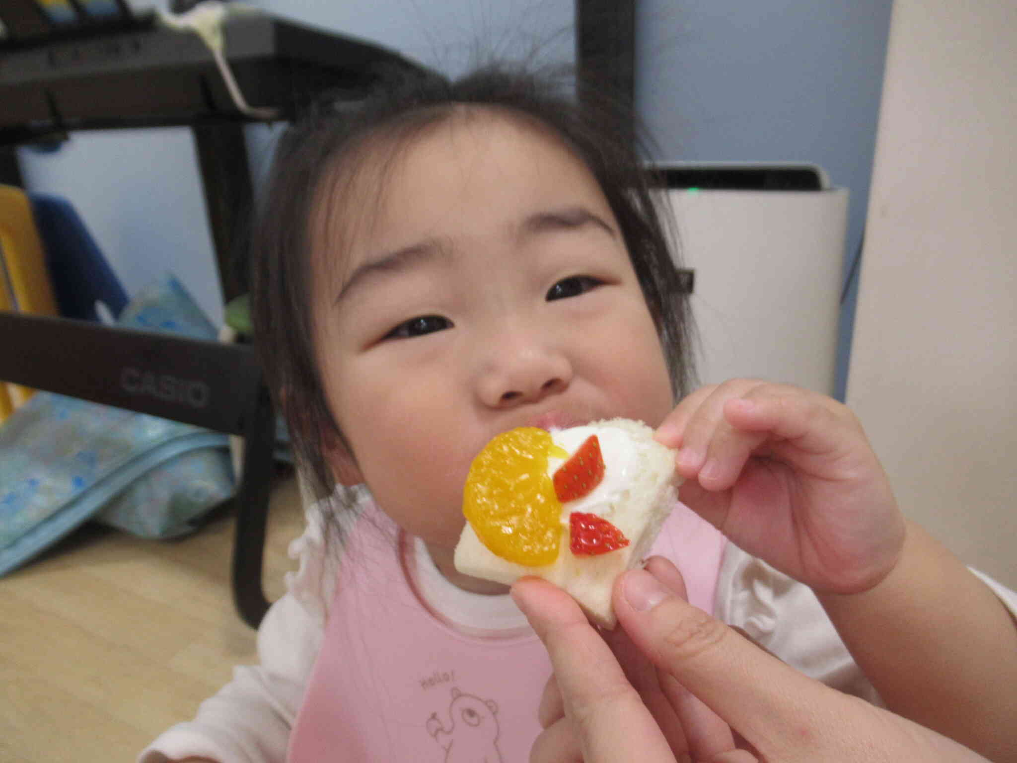 自分の作ったフルーツサンドを大きなお口でパクっ!