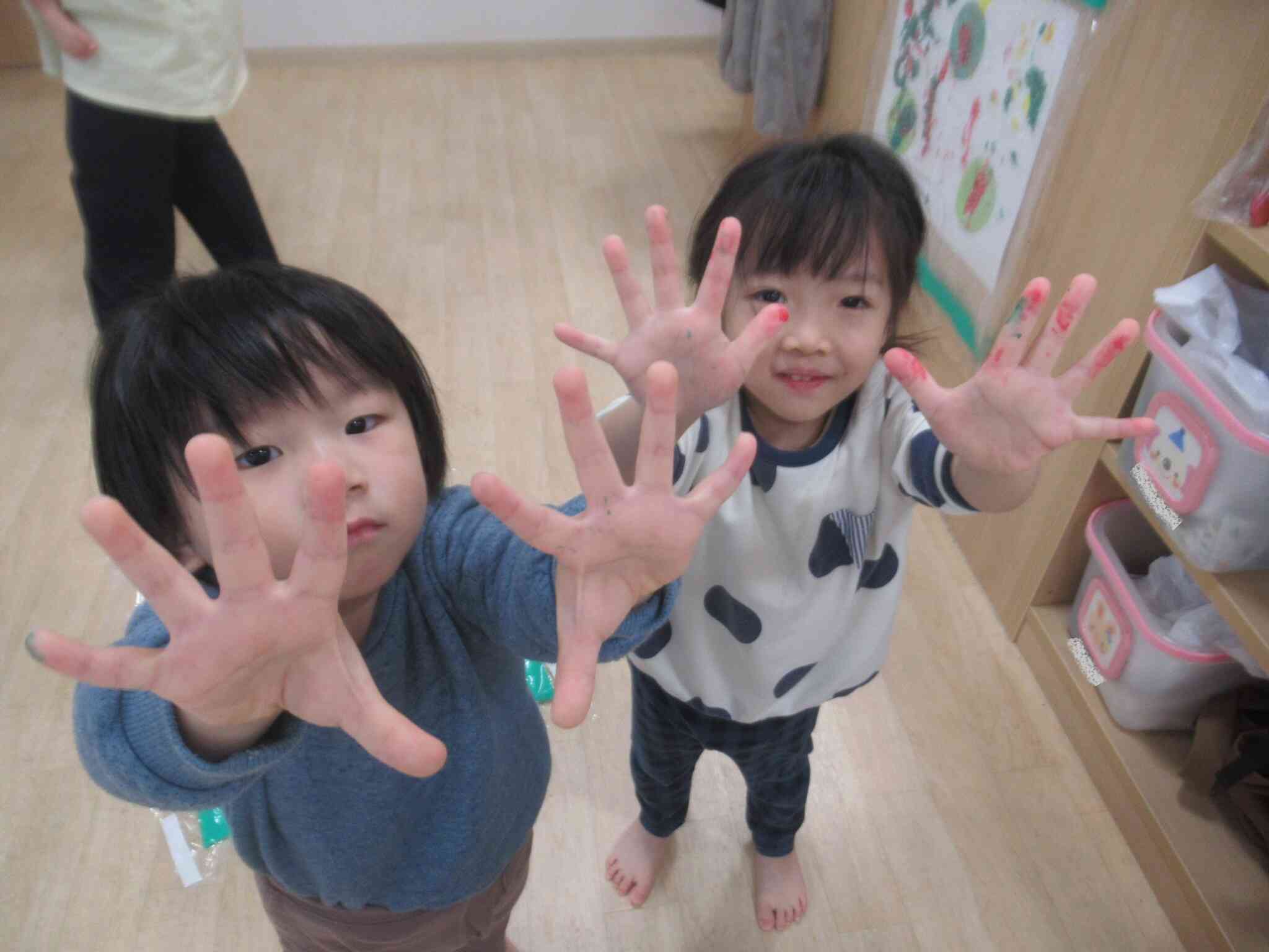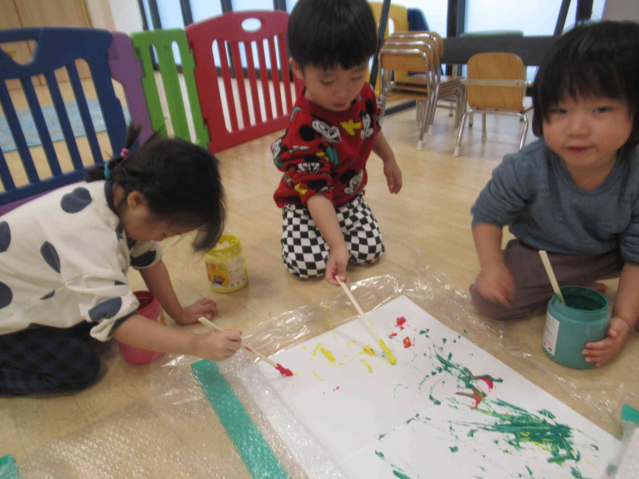 不思議な模様ができたり、絵の具が混ざって新しい色ができたり、絵の具を見て「きれいだね~」と言う子どもたちでした。