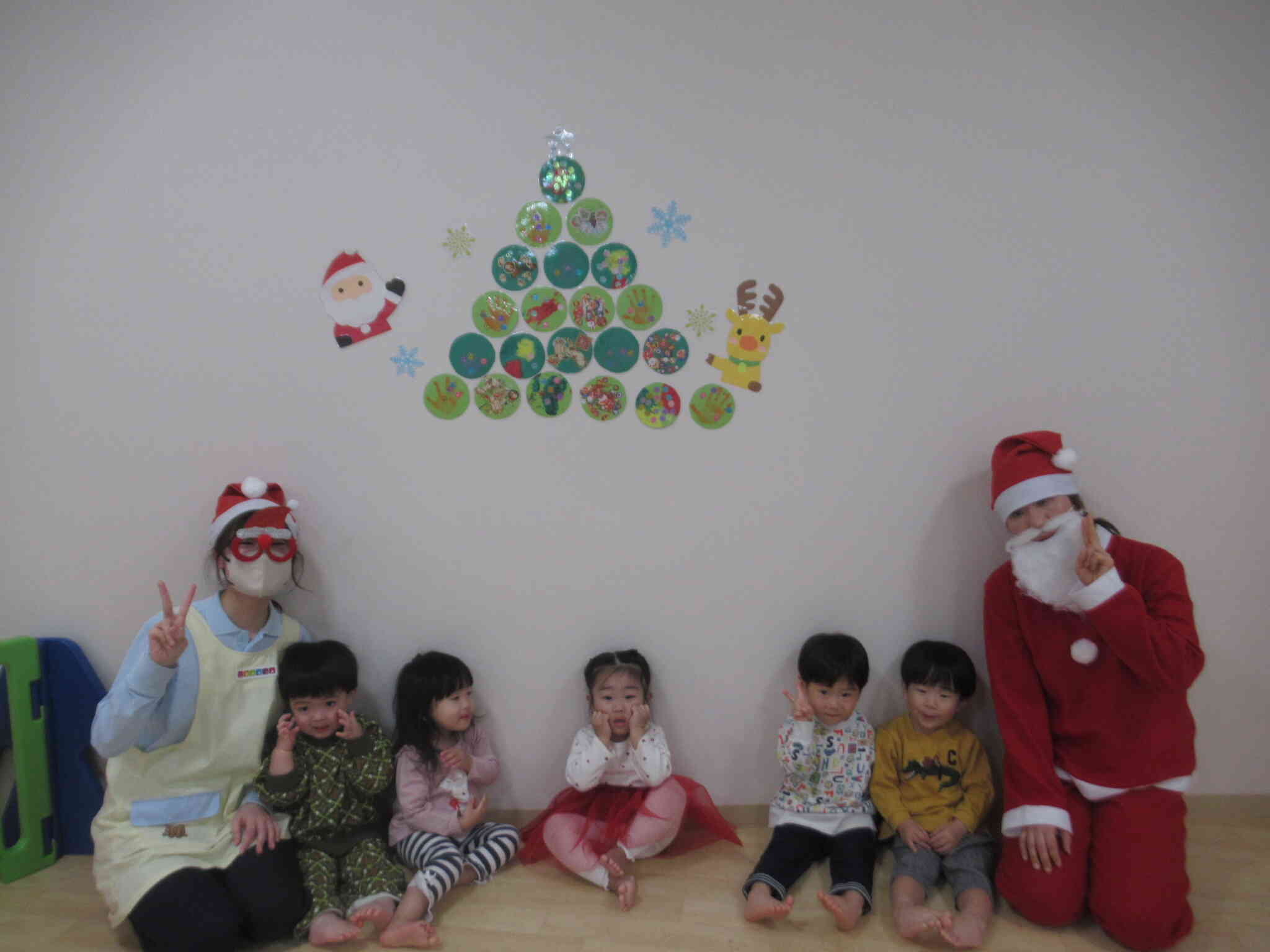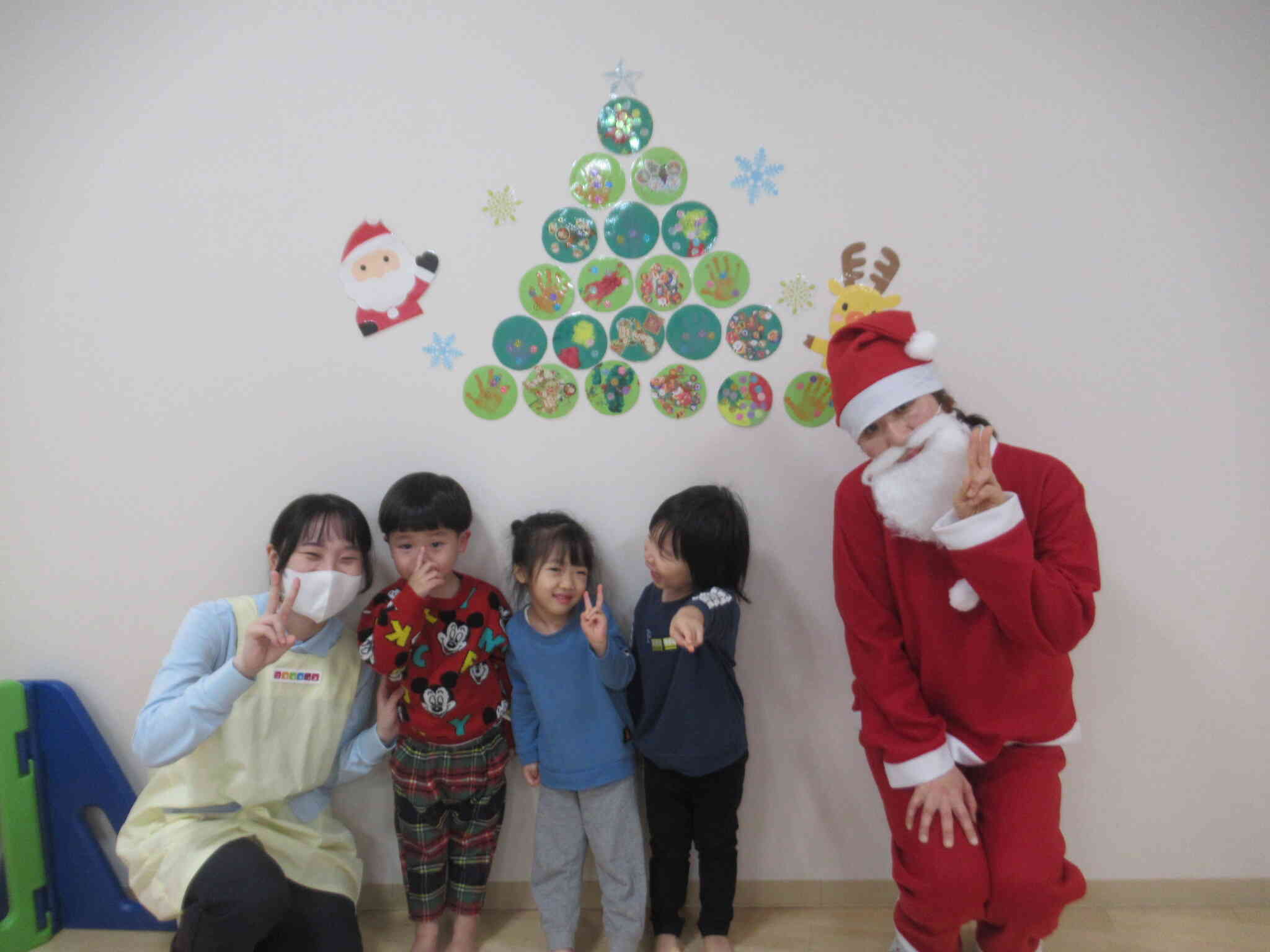 お部屋の中に飾ってある壁面のクリスマスツリーは子どもたちが製作でつくったオーナメントが集合して完成しています。