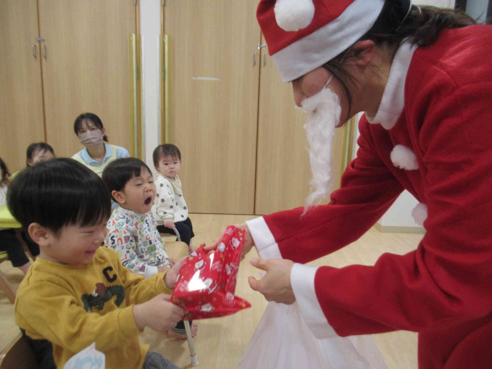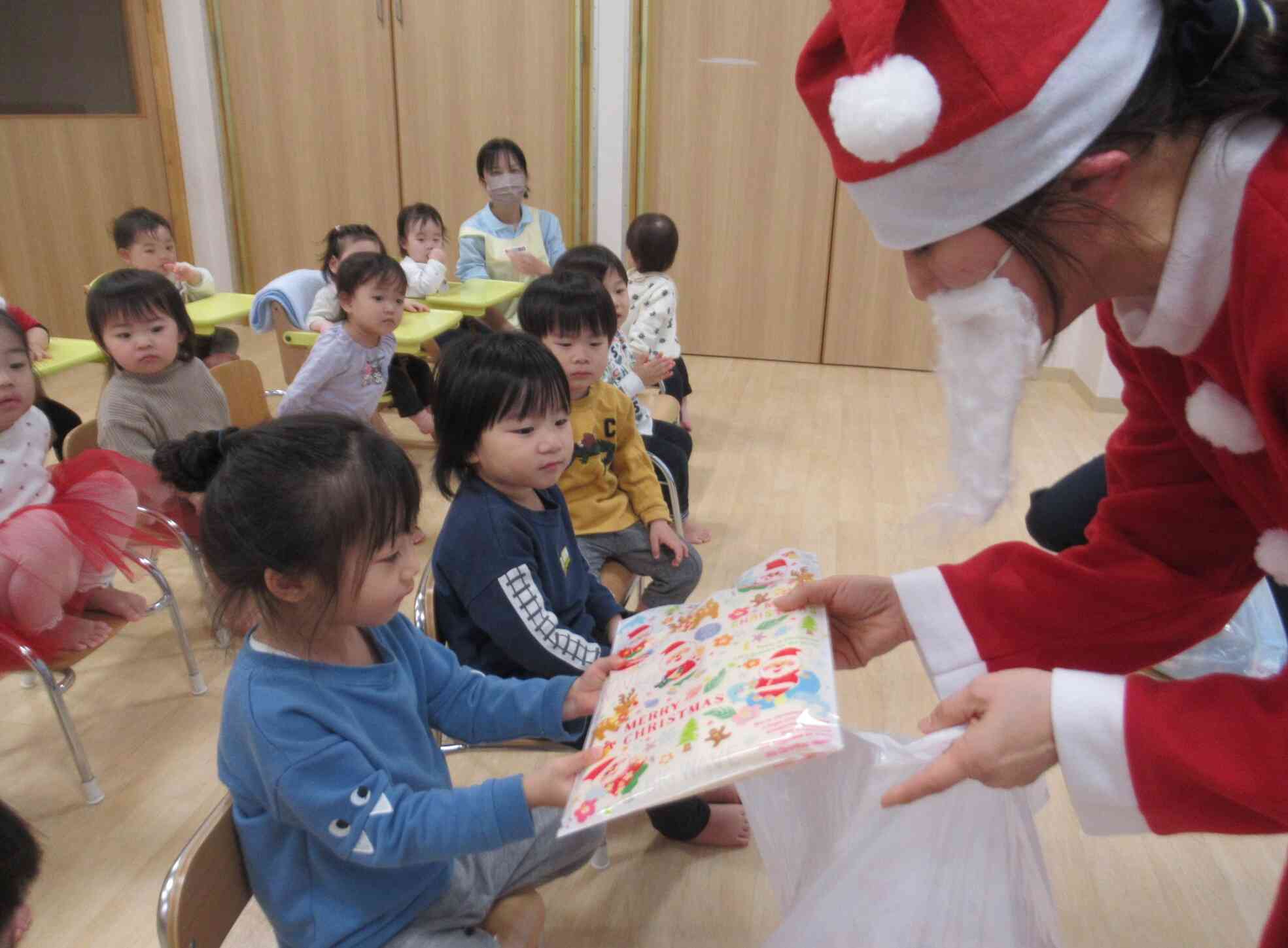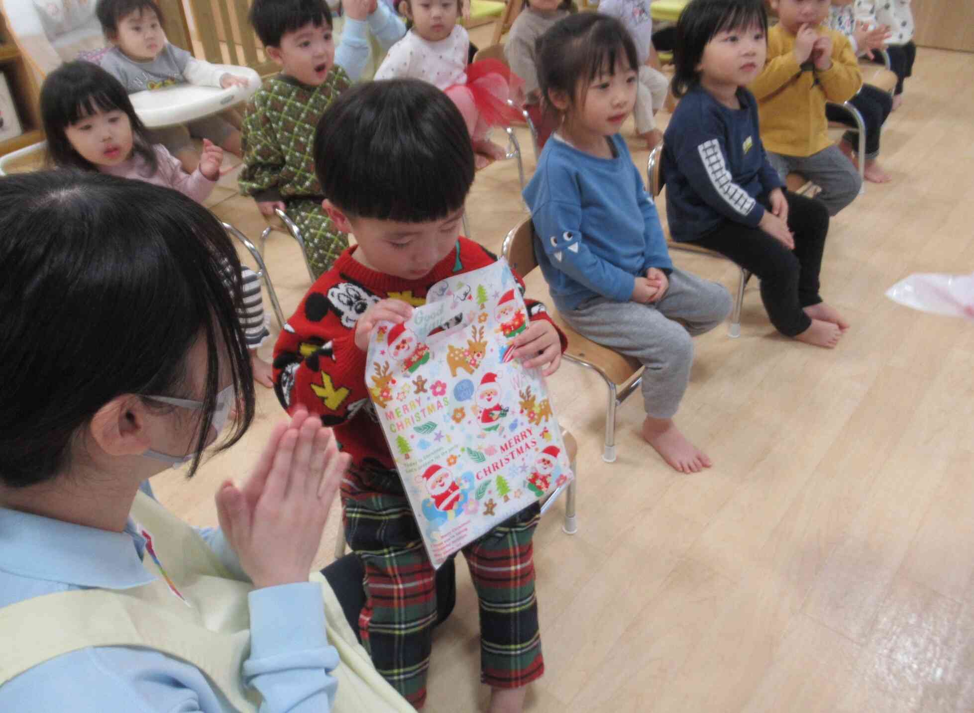 サンタさんからプレゼントを1人ずつ受け取りましたよ。