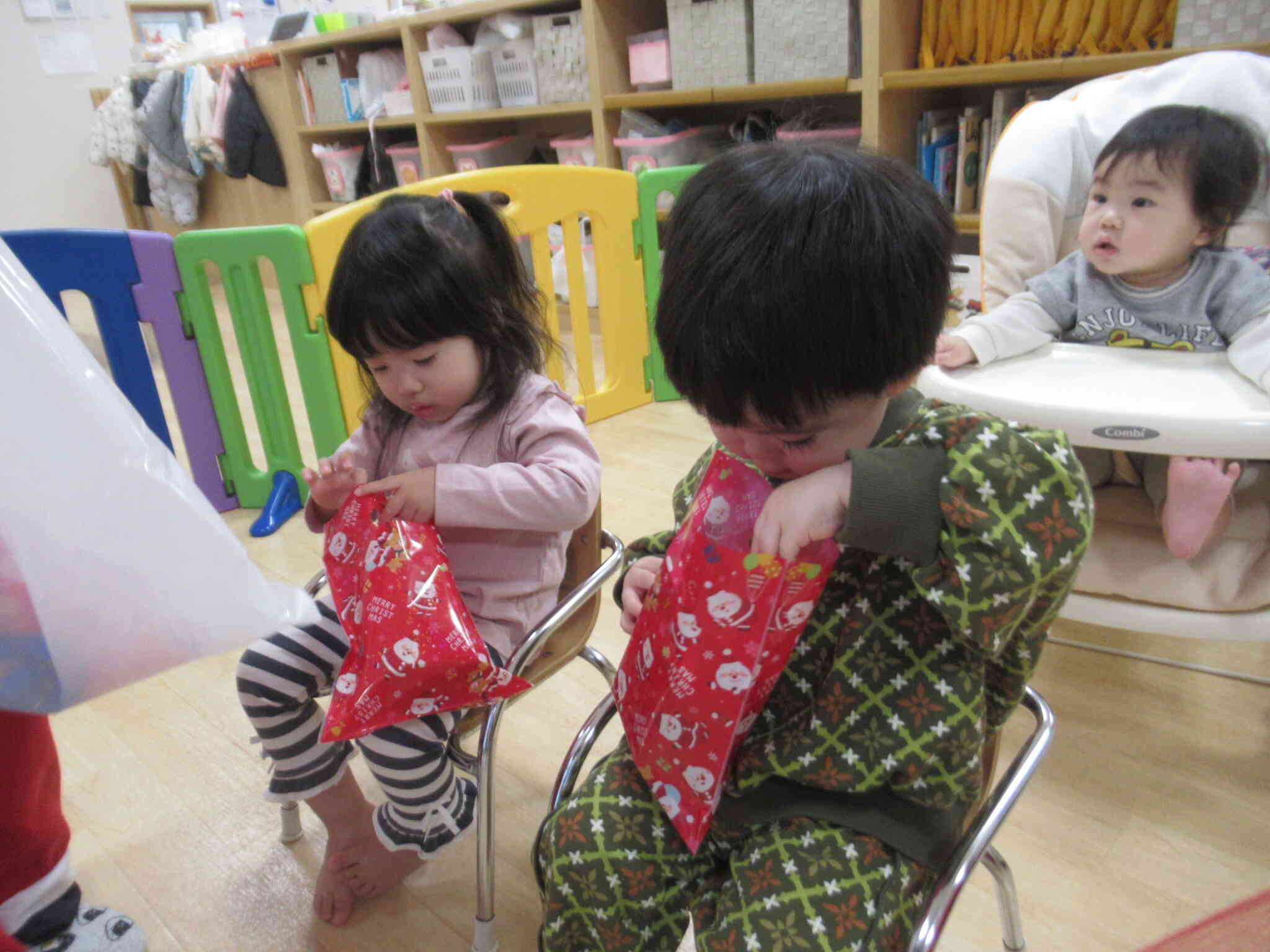 サンタさん、今年も保育園に来てくれてありがとう。プレゼントをありがとう!