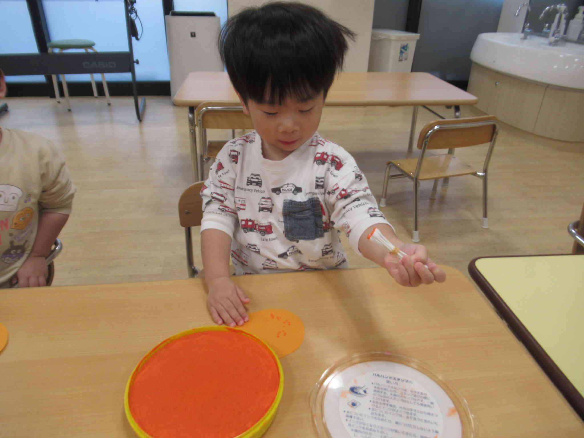 ペンや綿棒スタンプを使って、みかんに模様をつけましたよ。