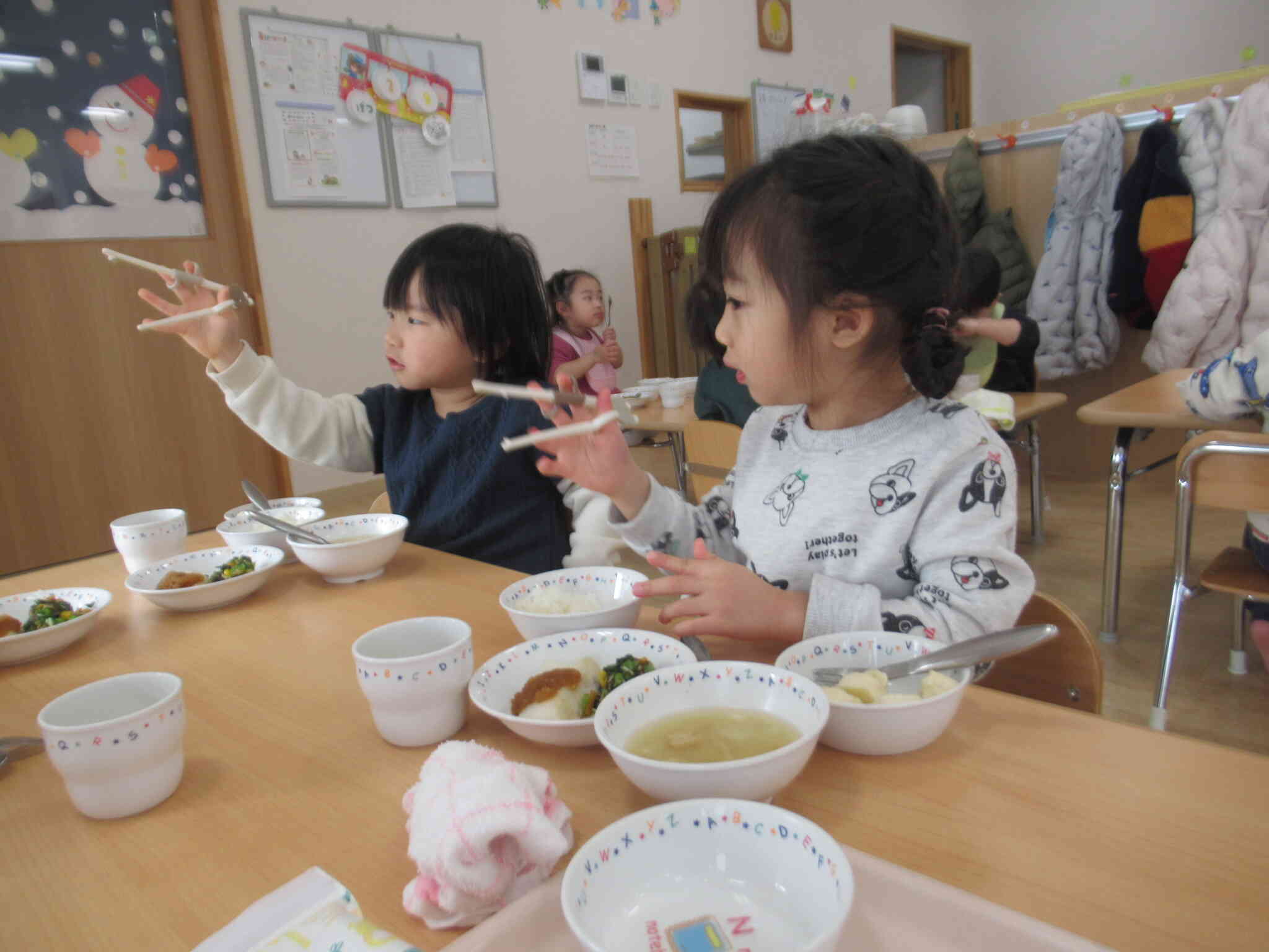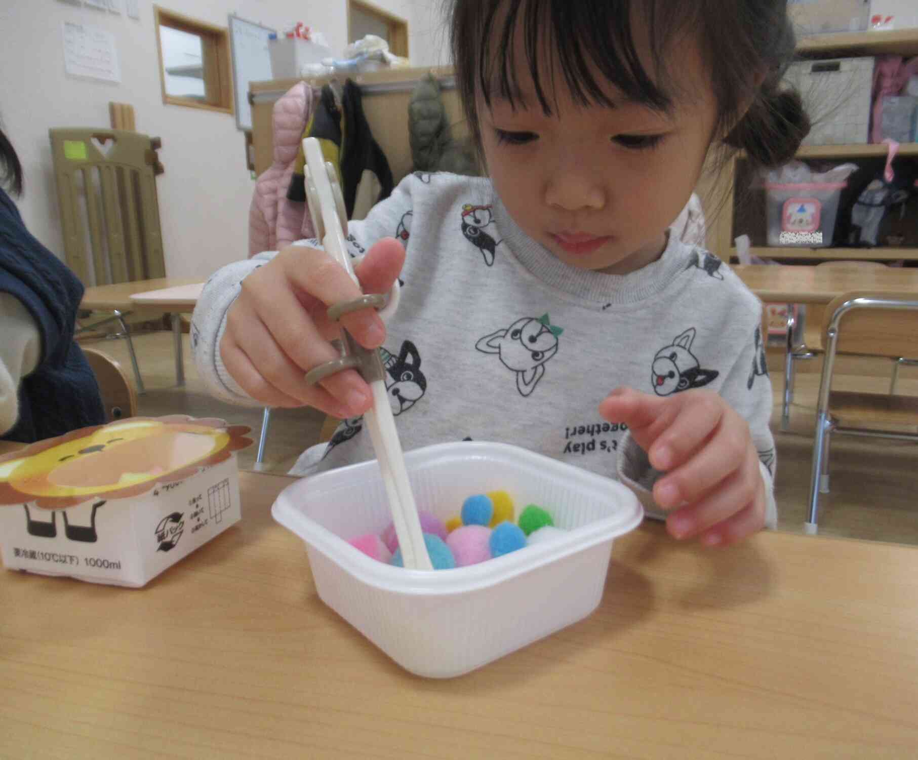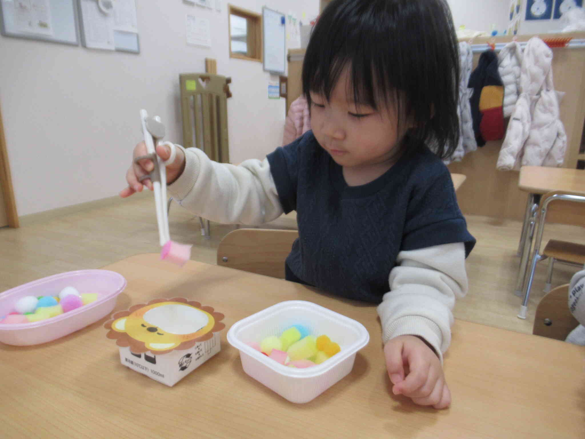 今月の食育は、2歳児さんとお箸を使う練習をしました。