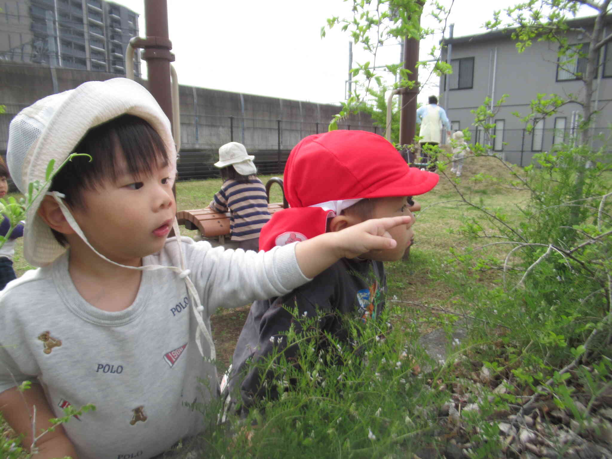男の子たちはてんとう虫を見つけたようです。