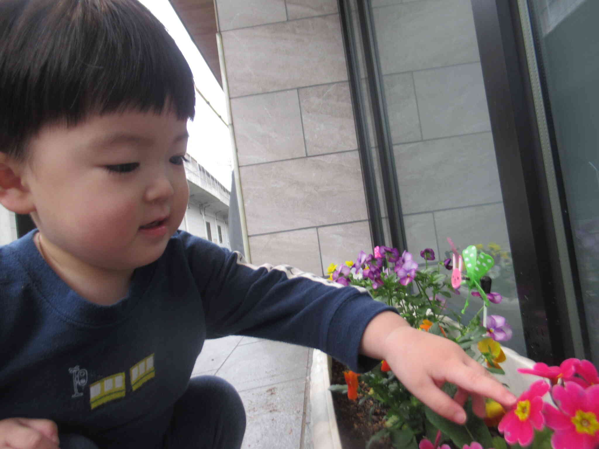 かわいいお花を触ってご機嫌の男の子でした。