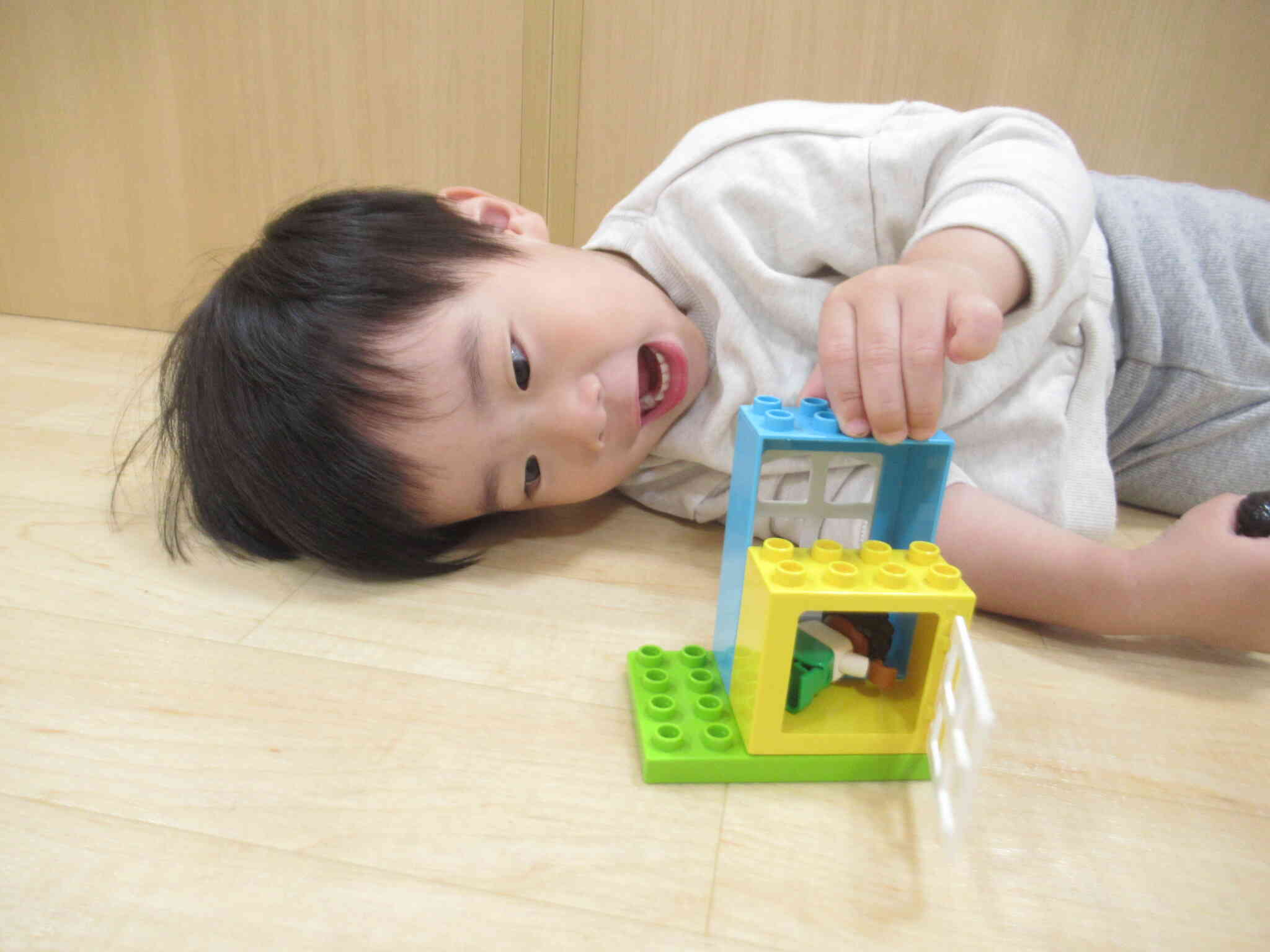 レゴブロックの窓を2つくっつけてお家を作っていました。