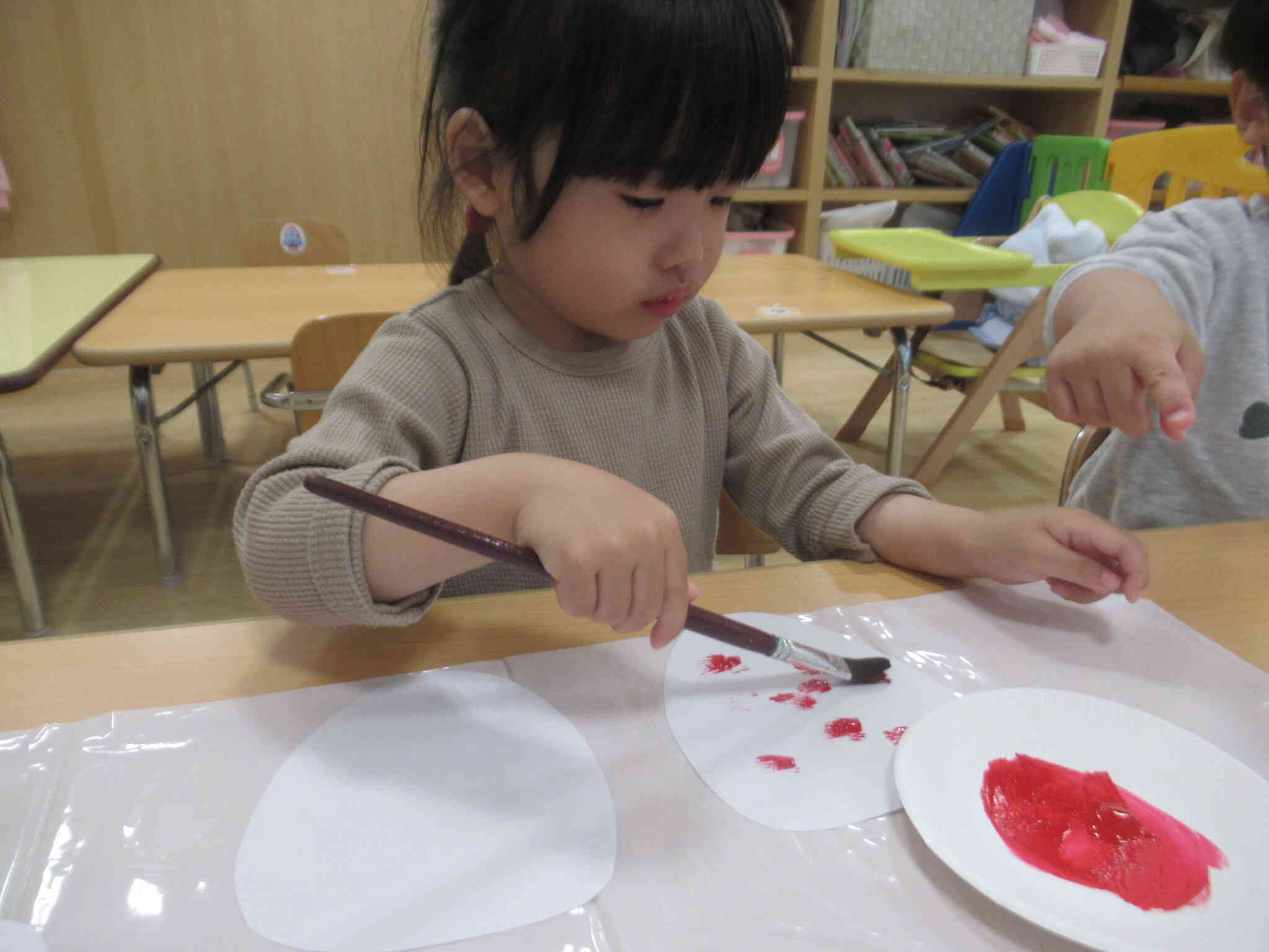 こちらの女の子は筆を持って、ちょんちょんと絵の具をのせていました。