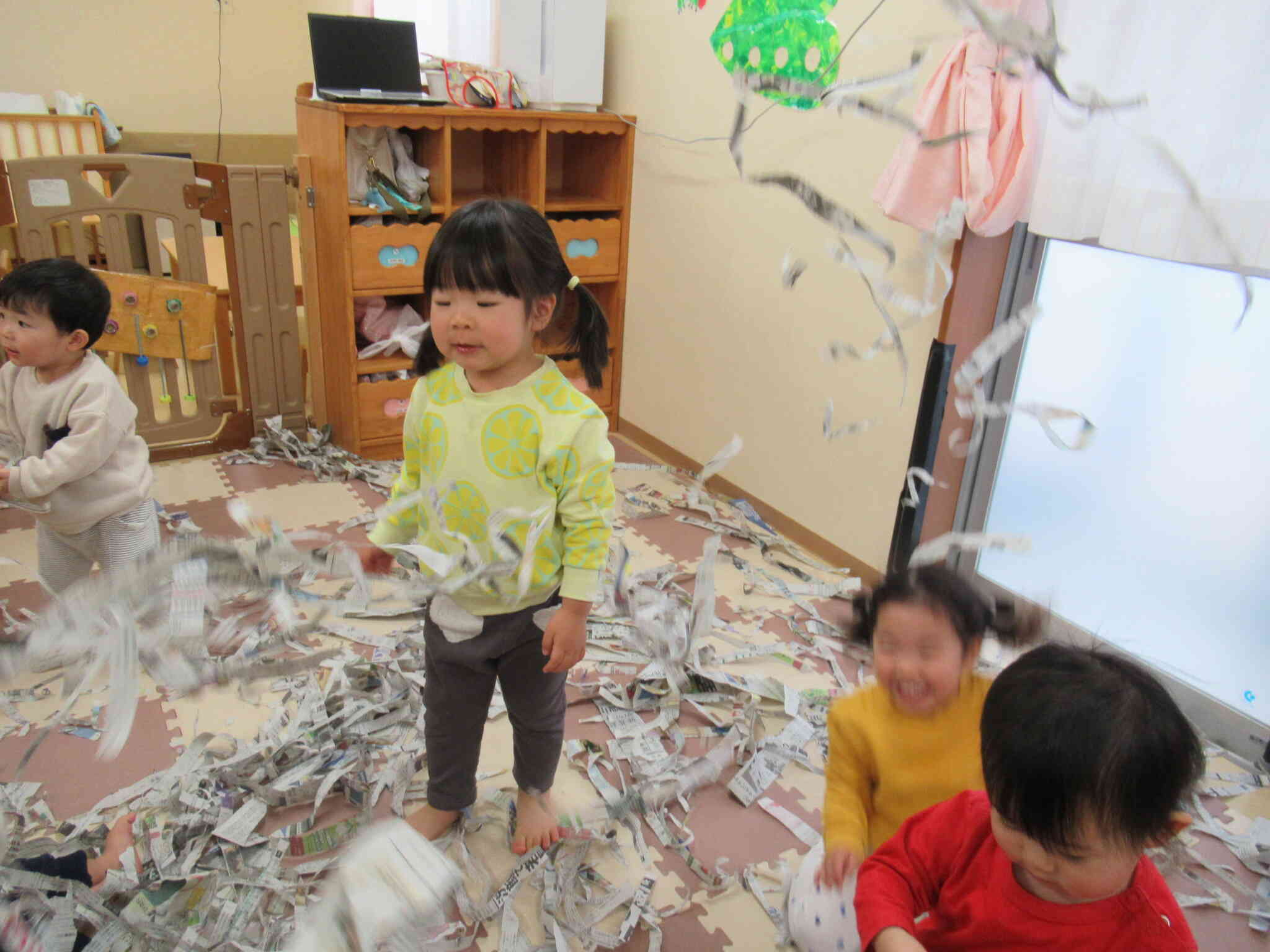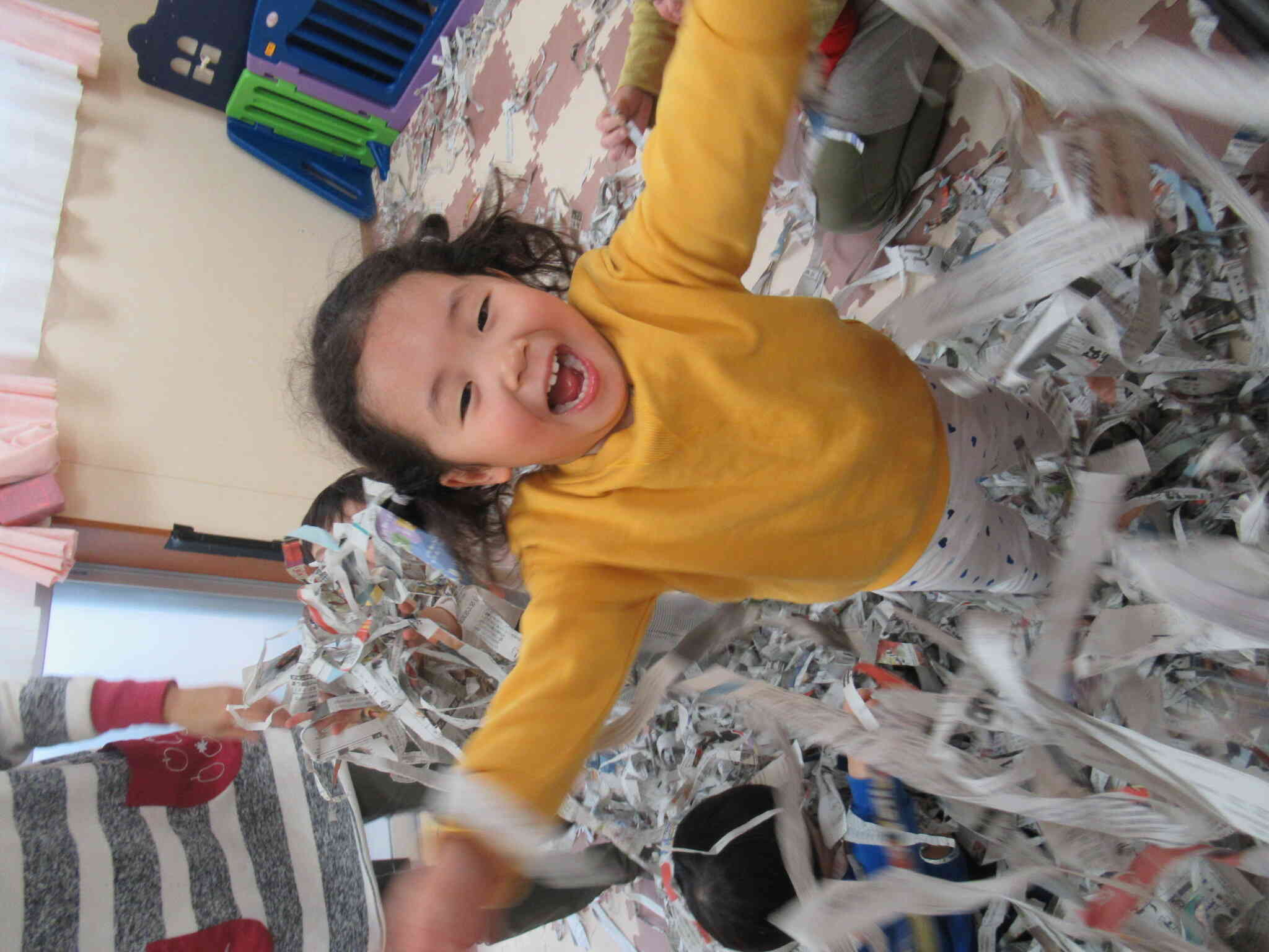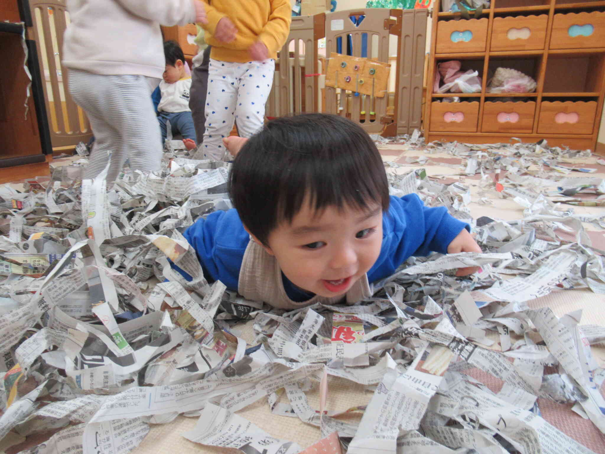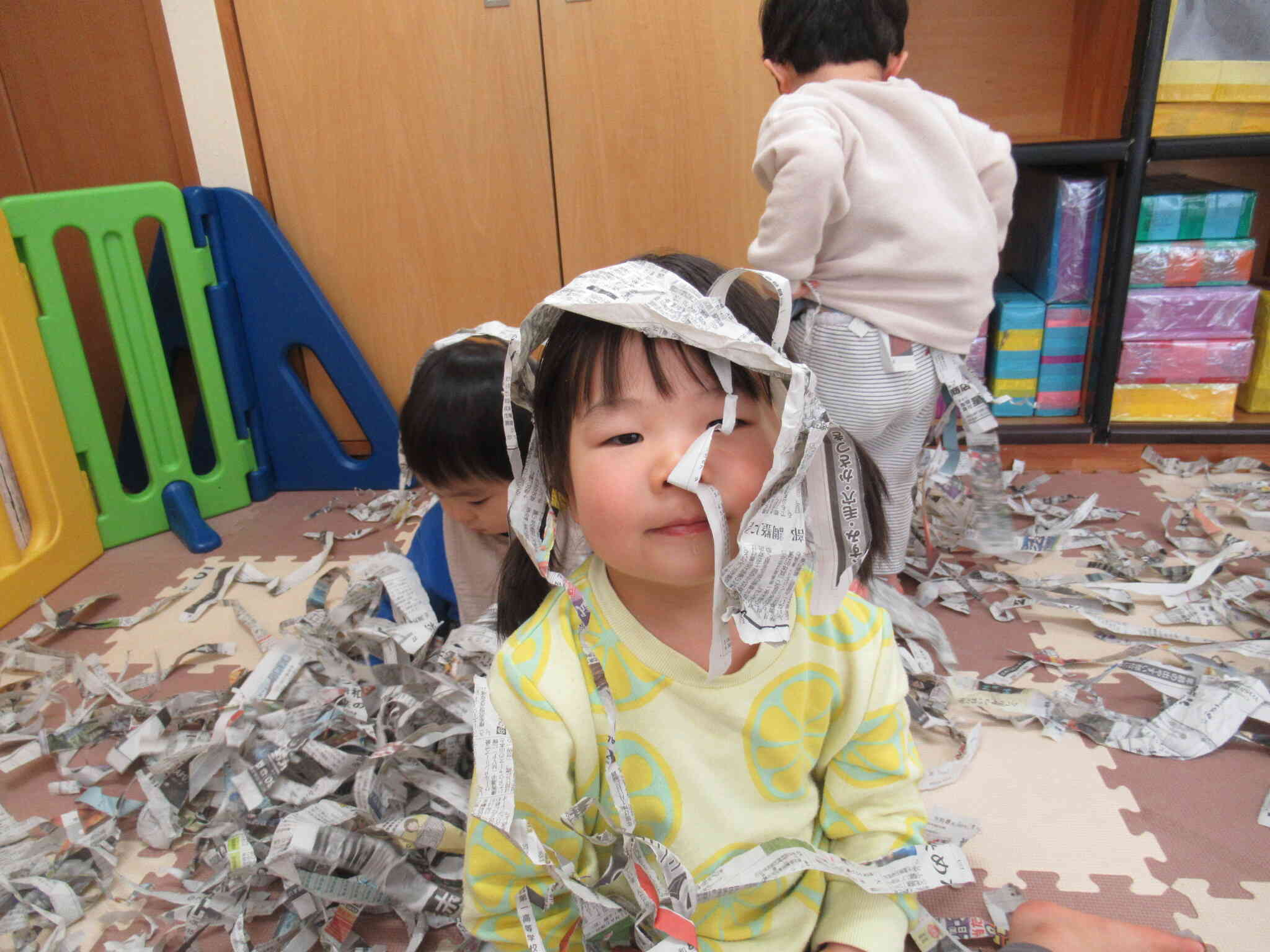 たくさんちぎった新聞紙のうえを