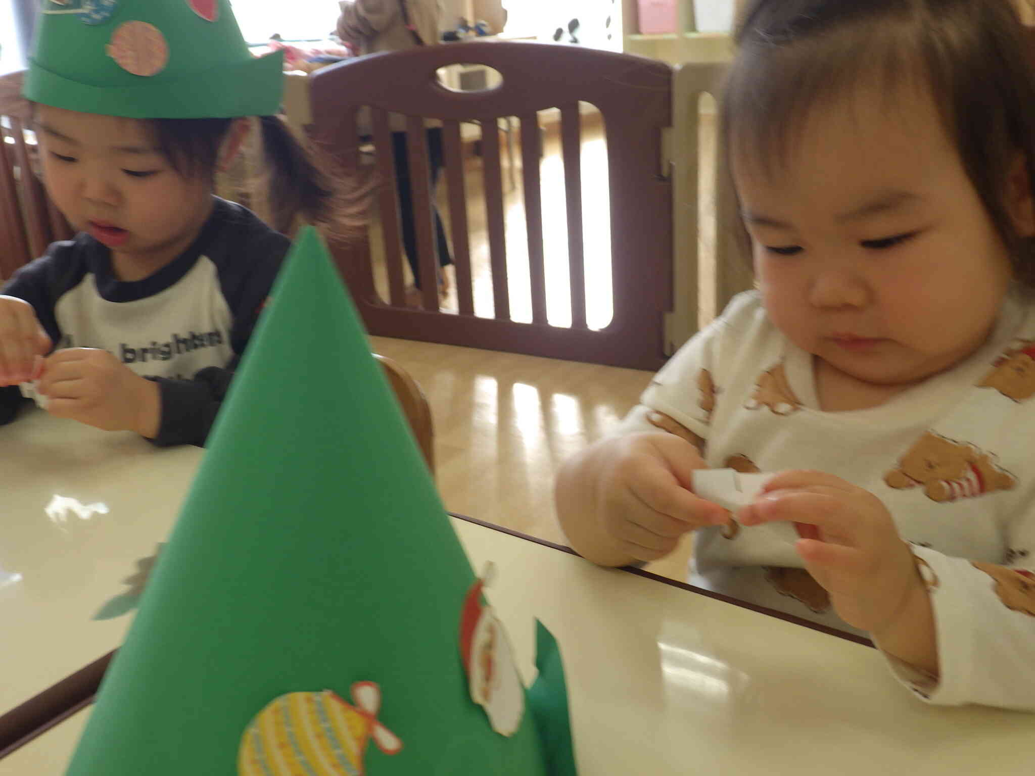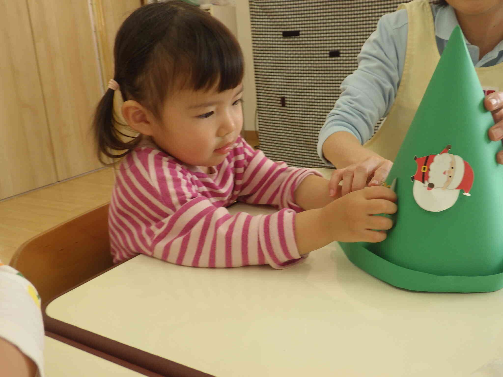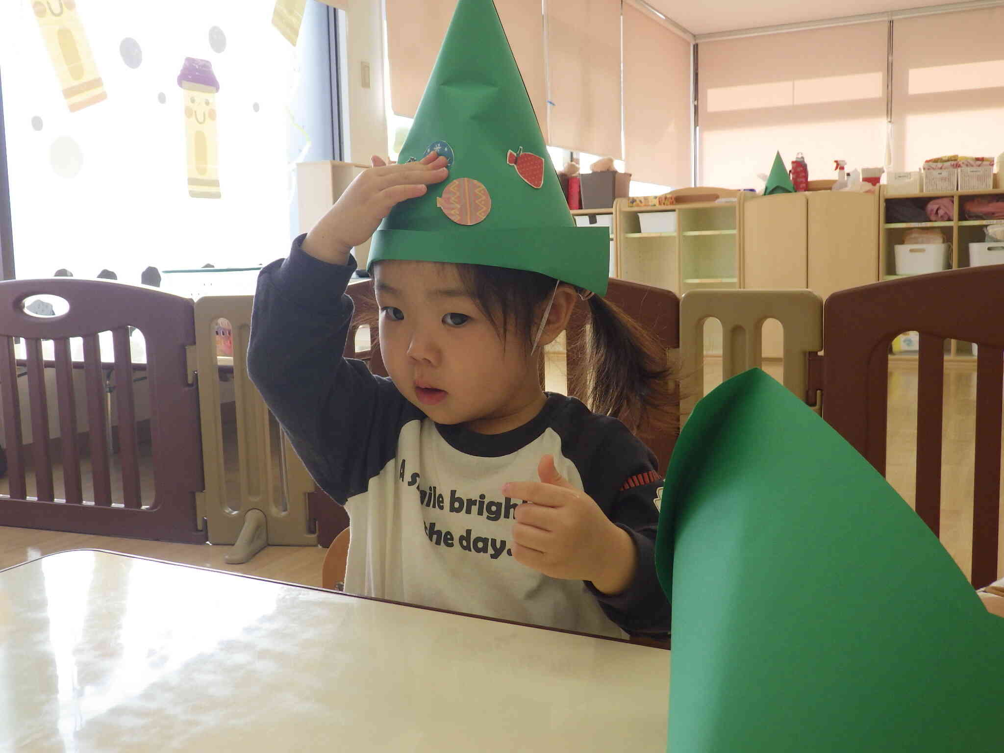 今日はクリスマスにかぶるとんがり帽子をつくりましょう~。