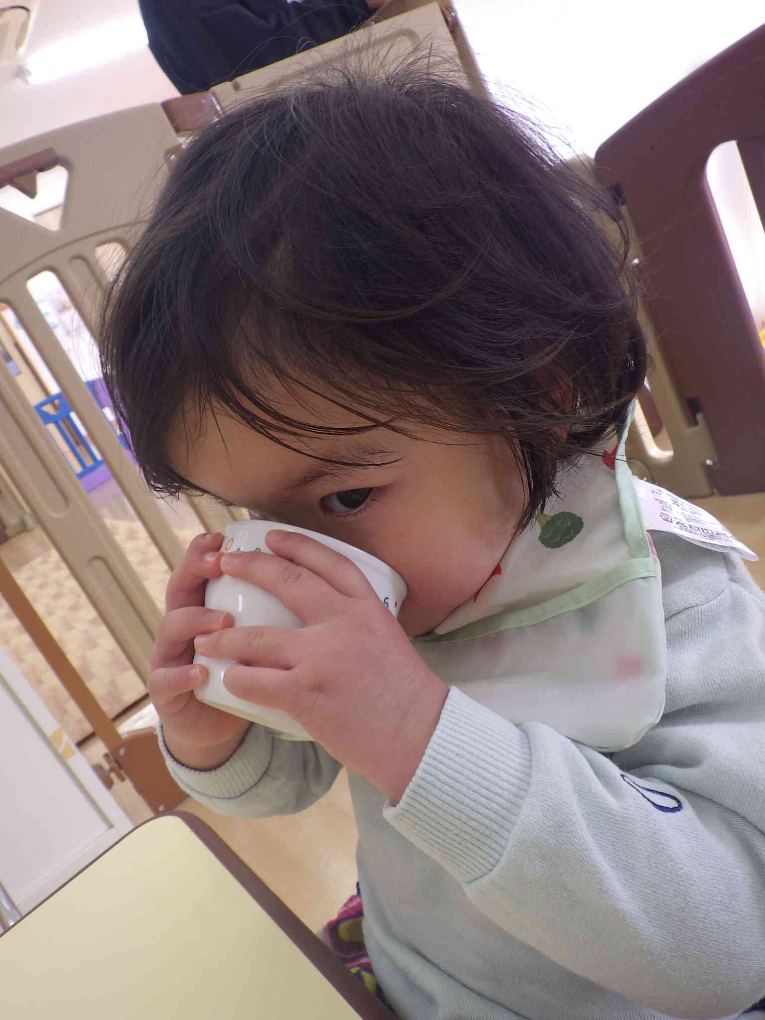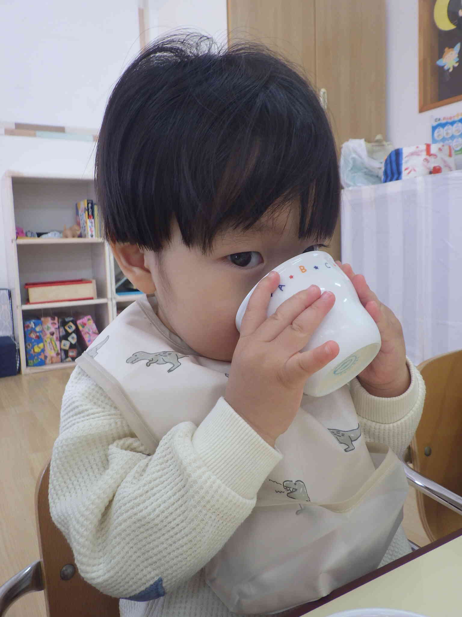 上手に両手でコップを持って飲むひよこ組のお友達。