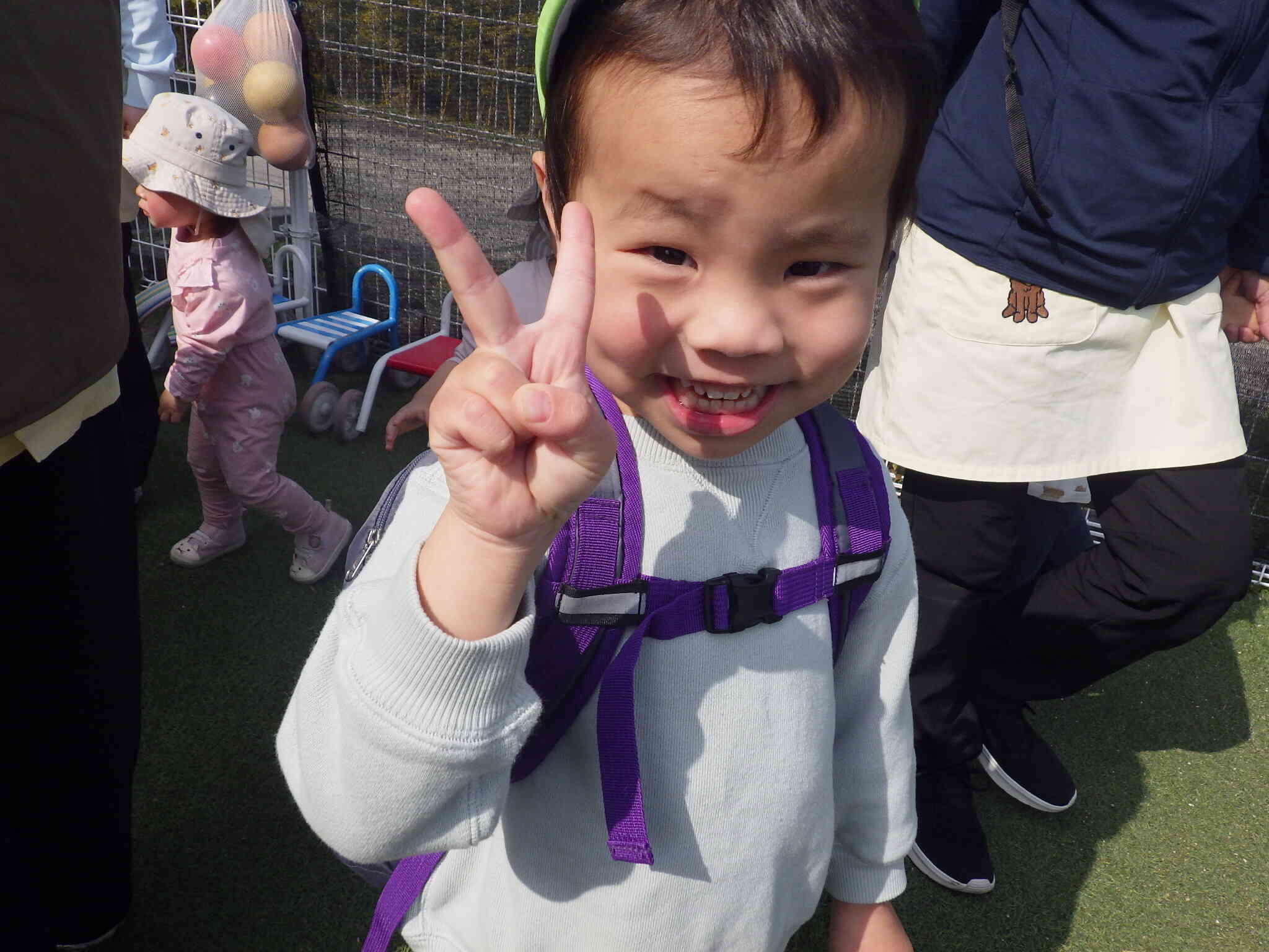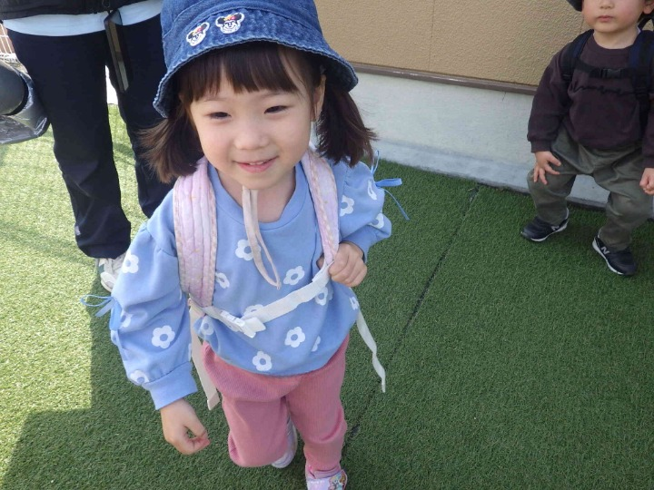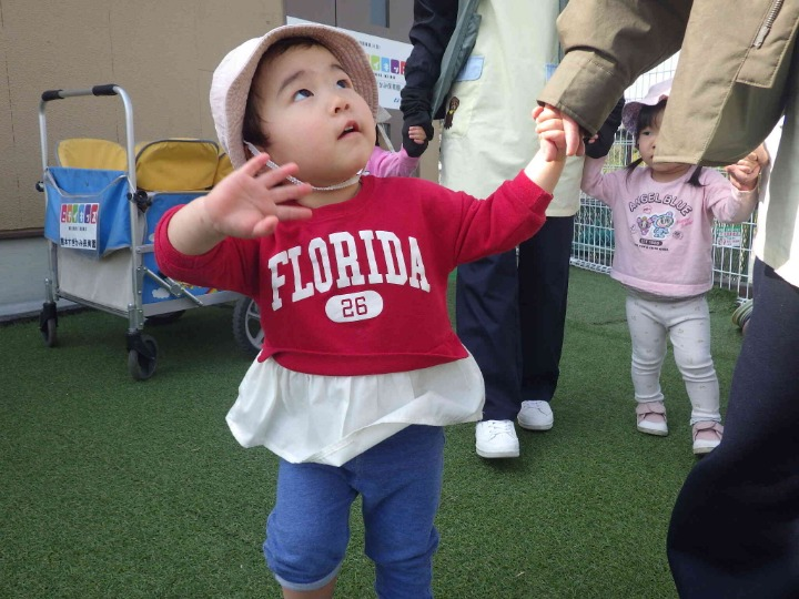 先生と手をつないで近くのグランドまでお散歩です。