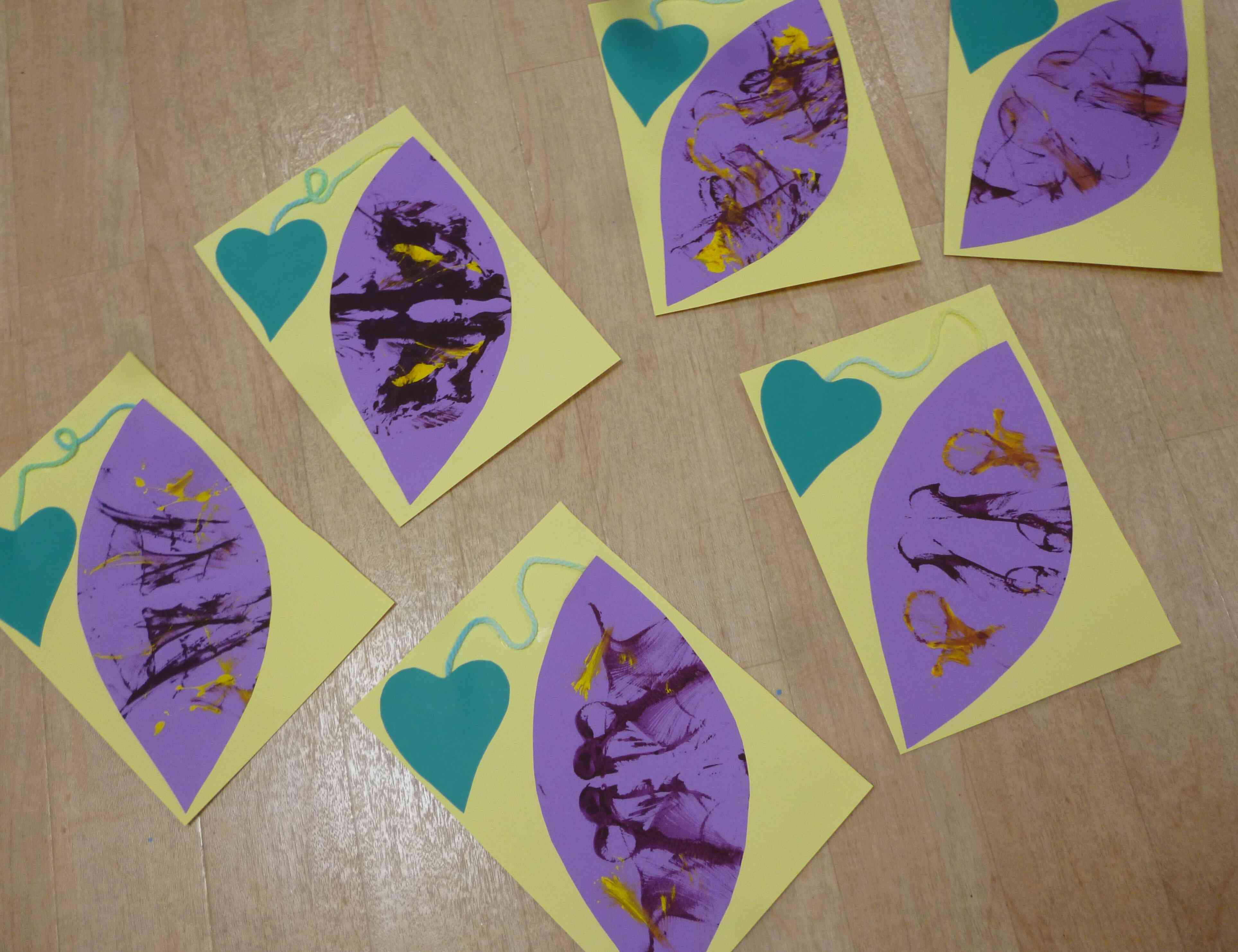 画用紙の間に絵の具を付けた紐を挟んで、引っ張ることで模様をつける“糸ひき絵”を