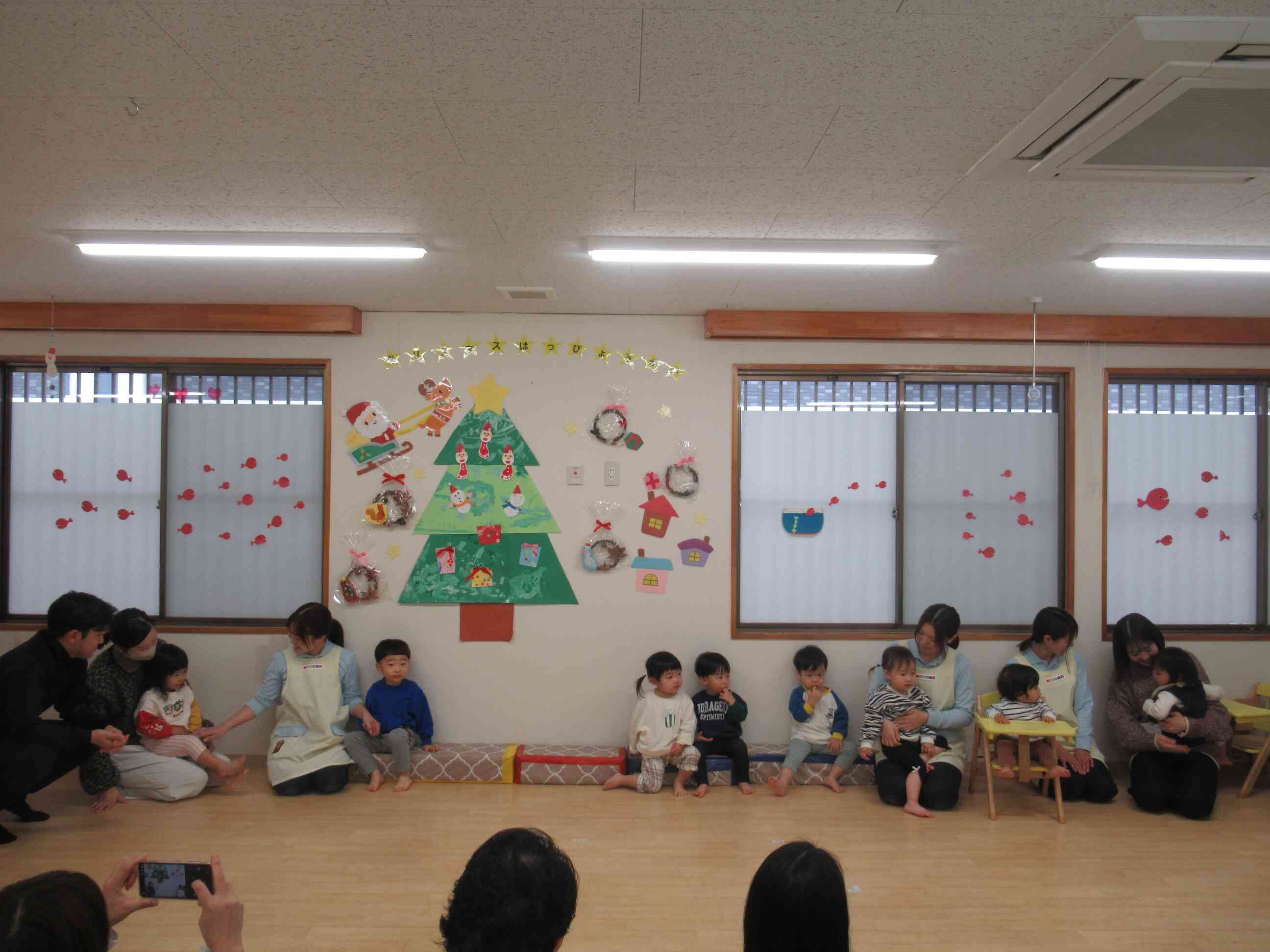今日はクリスマス発表会がありました。最初は先生からのお話のプレゼントで大型絵本を見ました。クリスマスにちなんだ形がたくさんでてきましたよ。