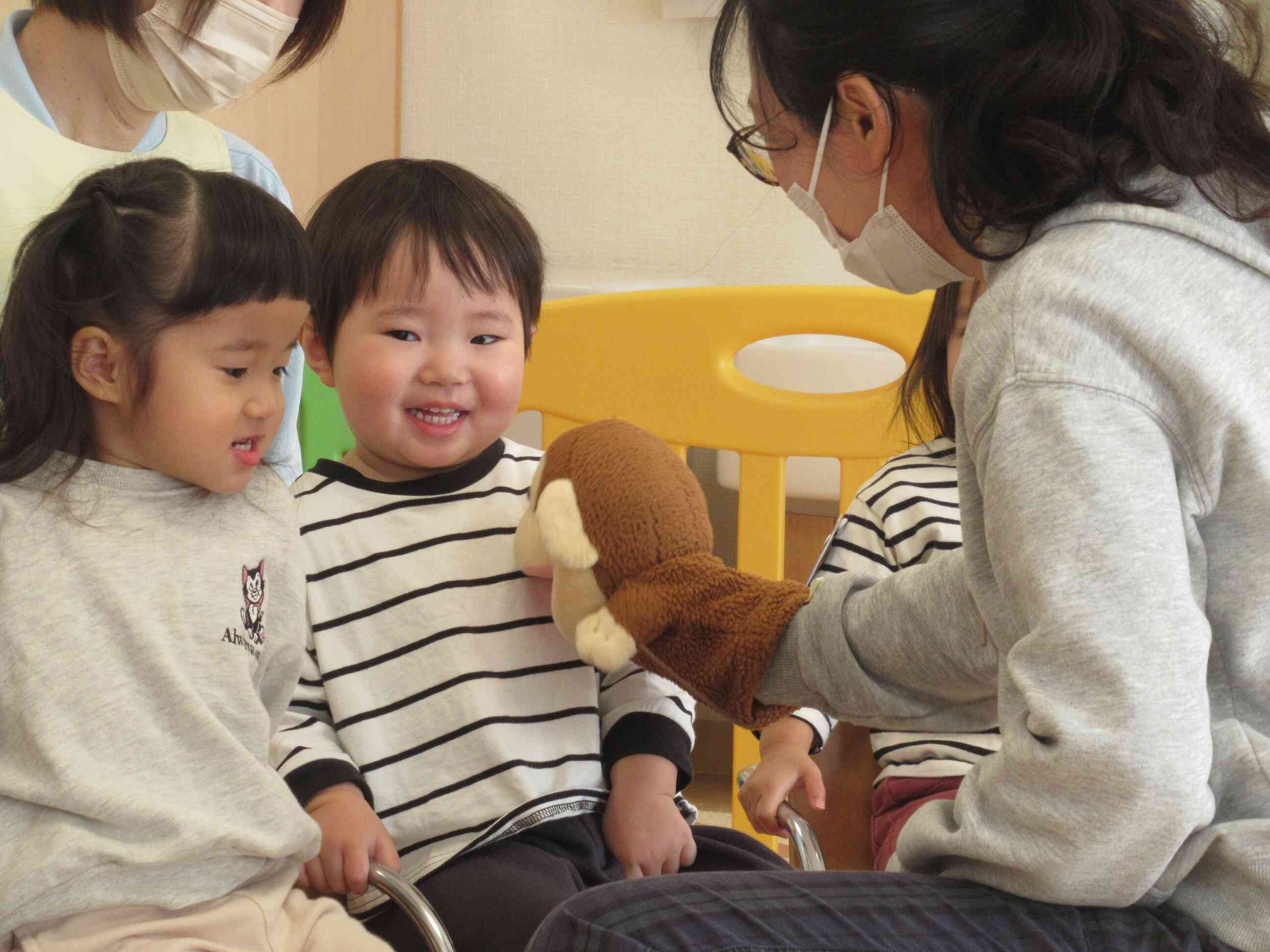 英語のレッスン時にいつも一緒に来てくれる、おさる(パペット)のニッキーがみんな大好き!!