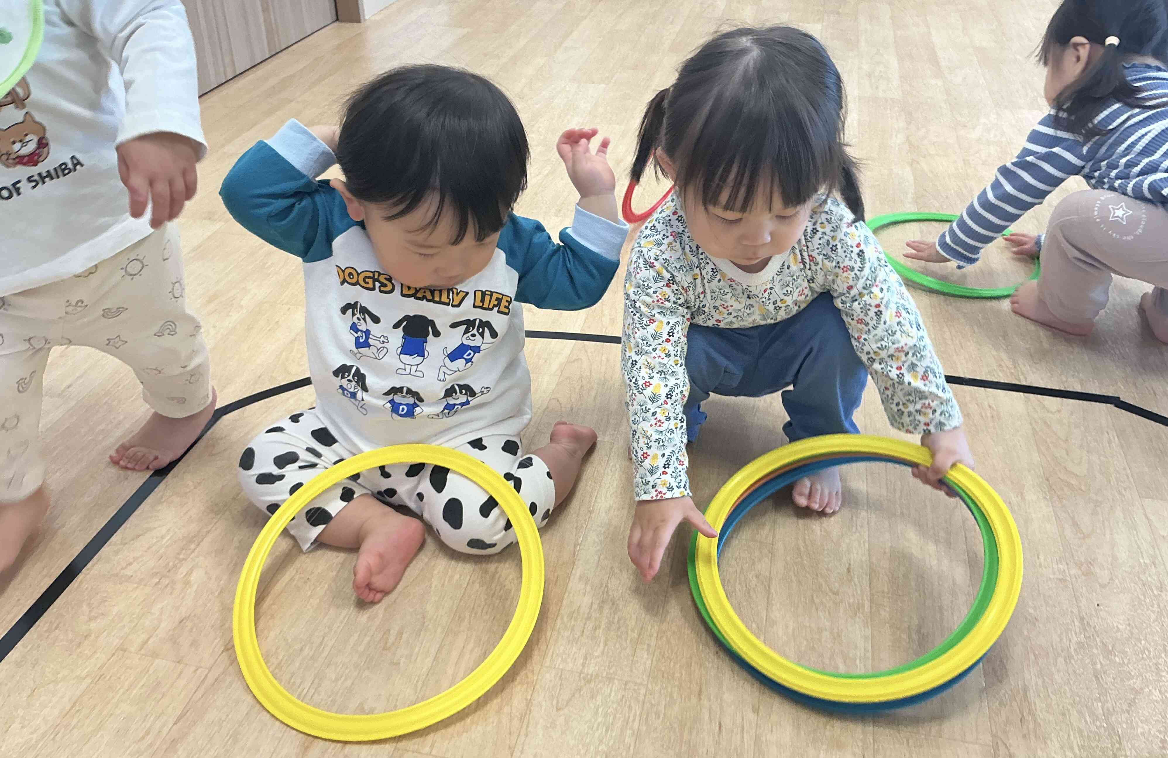 お友だちや保育者の真似っこをしながらフープの上を上手に跳んでいます。 楽しいね!