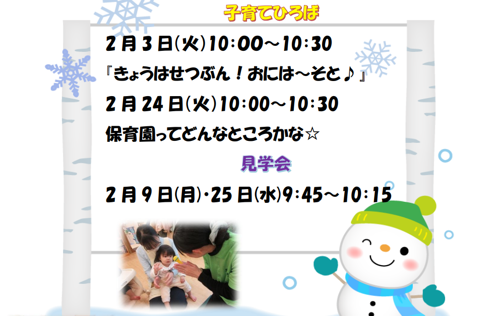 早いものでもう2月となりました。今年度もあともう少しで終わってしまいますね。新たな旅立ちと環境の変化に向けて保護者の皆様も準備を進めていらっしゃるのではないでしょうか…。木々の芽も少しずつ膨らみ始め、冬の寒さの中お日さまや土から栄養をもらい春にきれいな花を咲かせようと頑張っているのを感じます。子どもたちも1年の間にたくさん遊んでできることも増えました。それらを栄養に、力を蓄え大きく成長し、進級・進学という素敵な花を咲かせるのですね。みんなで元気に春を迎えられるように一日一日を大切に過ごしたいと思います。