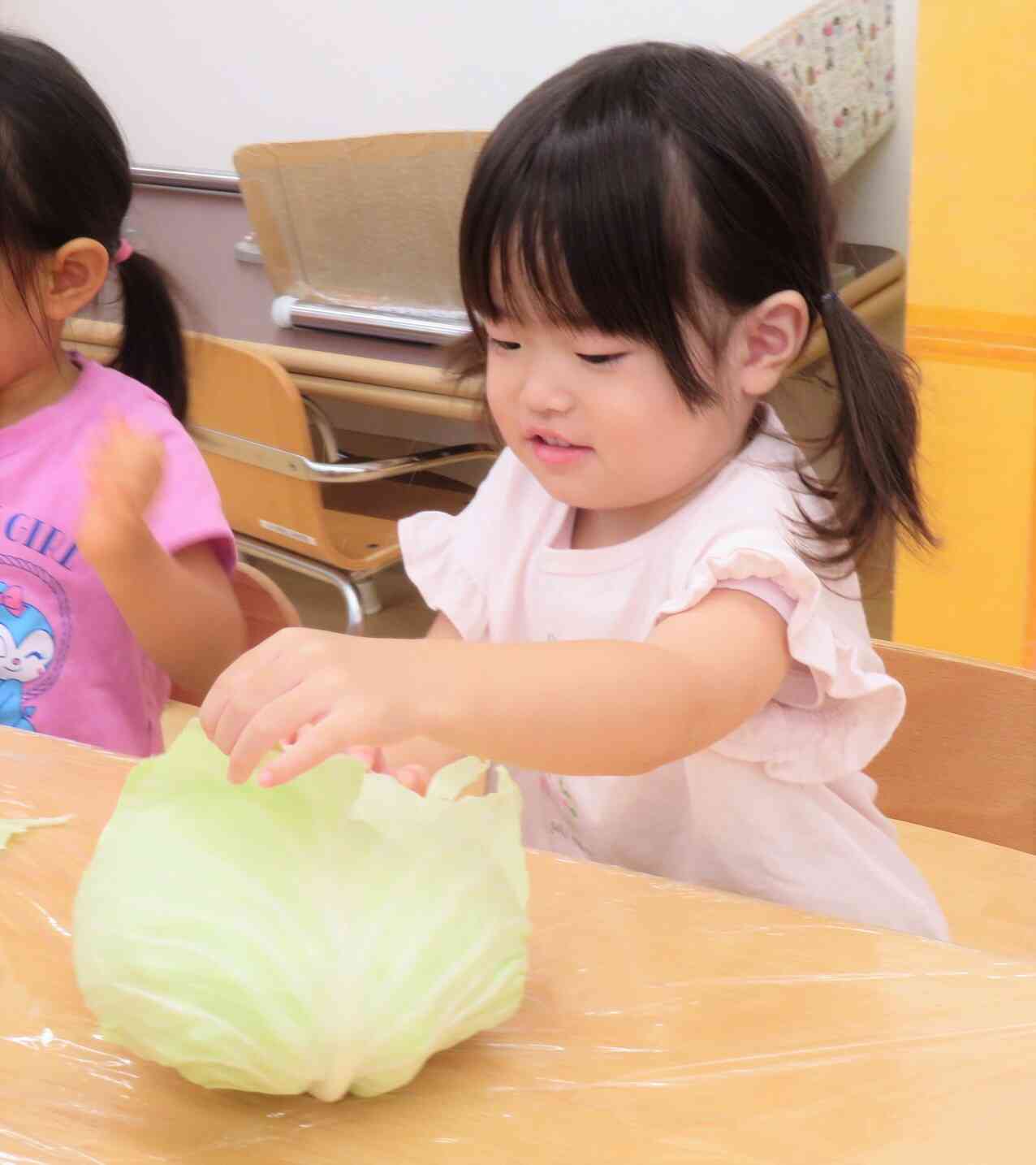 今月の食育はキャベツの葉っぱちぎりをしました。