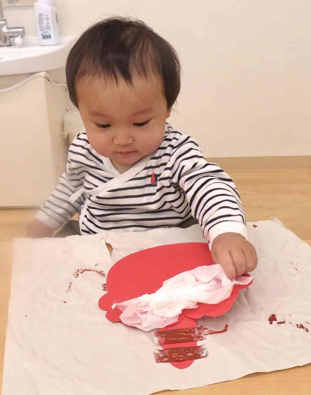 0歳児ひよこ組さんは、鬼の型紙の上に