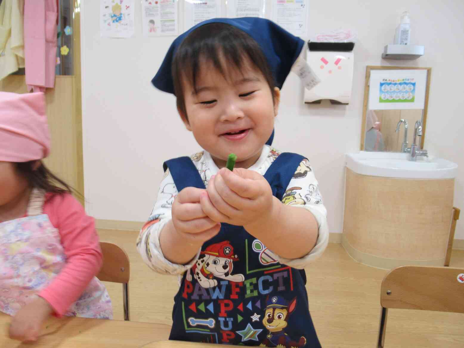 今が旬のお豆をたくさん用意してもらい、どんな違いがあるか見たり、さわったり、匂いをかいでみたり。皮むきにも挑戦しましたよ。