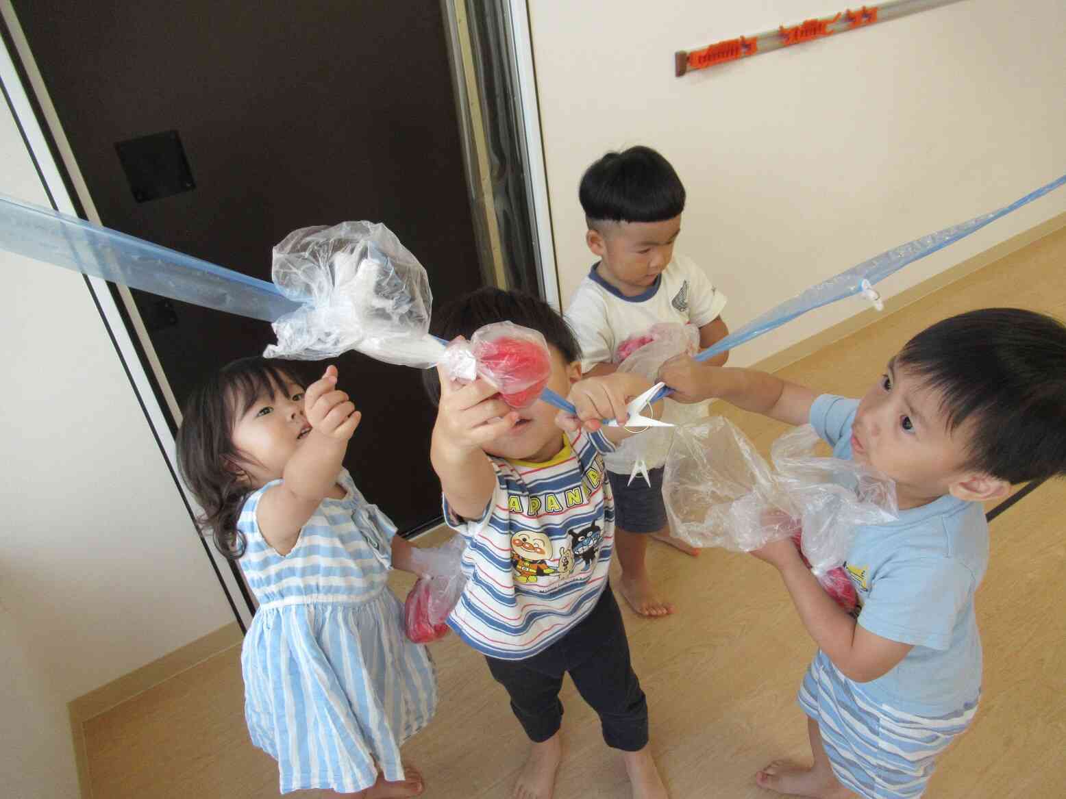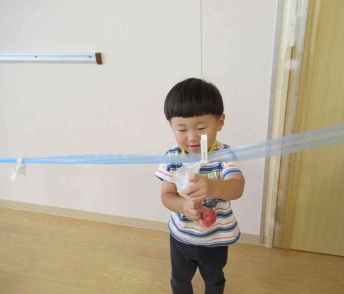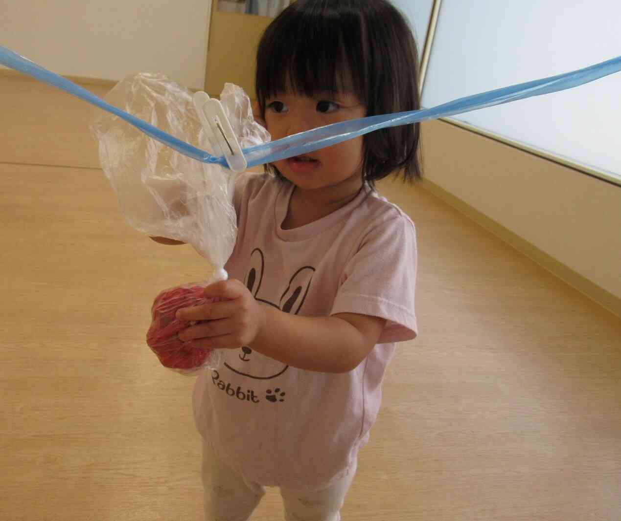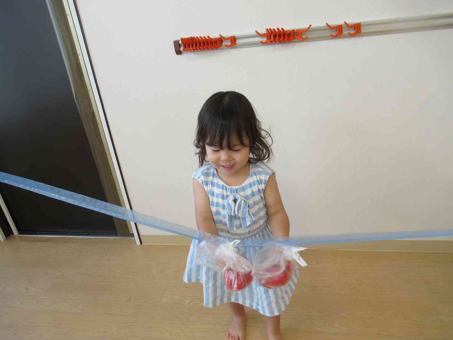 お部屋に完成したりんごをつるして、りんご狩りをしました‼