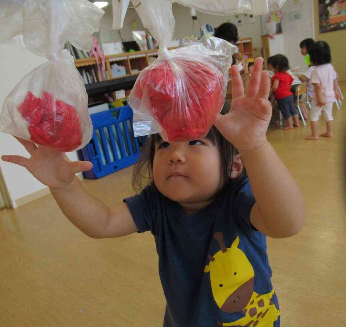 丸めた新聞紙を赤い花紙で包み、りんごの完成に大喜びです!