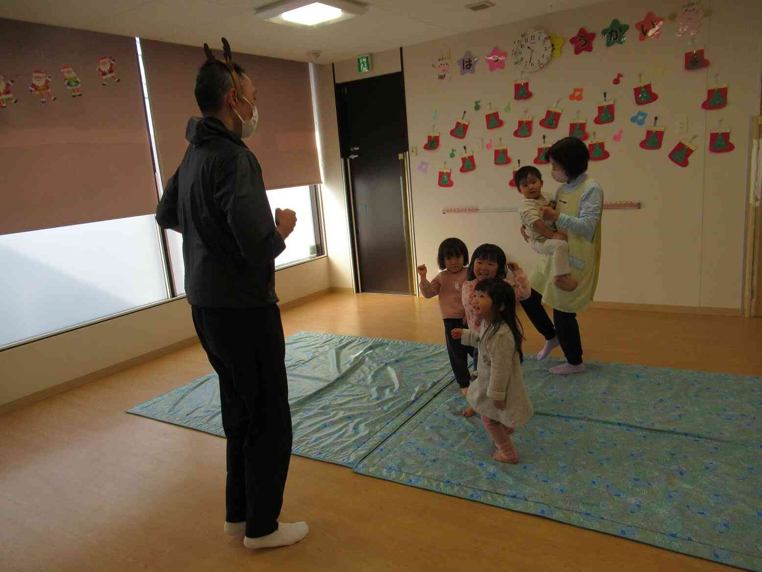 トナカイの格好のチャンウェイ先生♫ プレゼントの絵のついたカードに興味津々の子どもたちです♪
