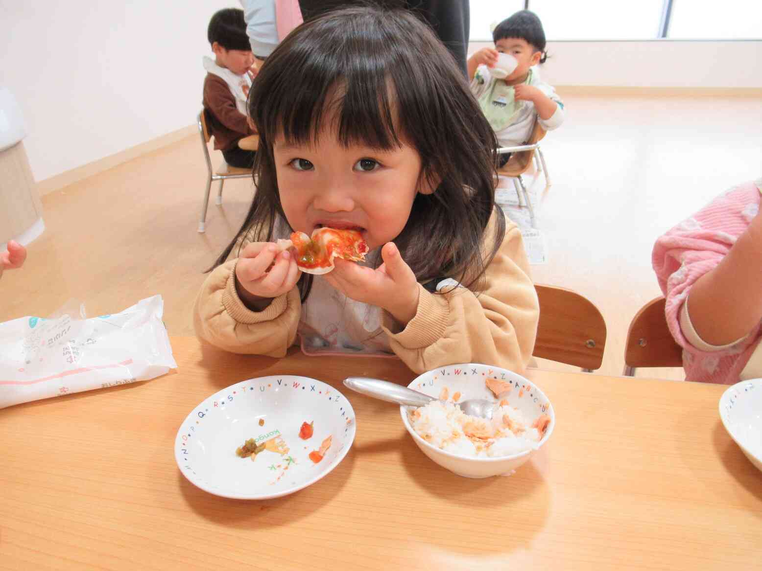 自分で作ったピザをパクリ‼「おいしいね~♫」の会話が聞こえてきます‼