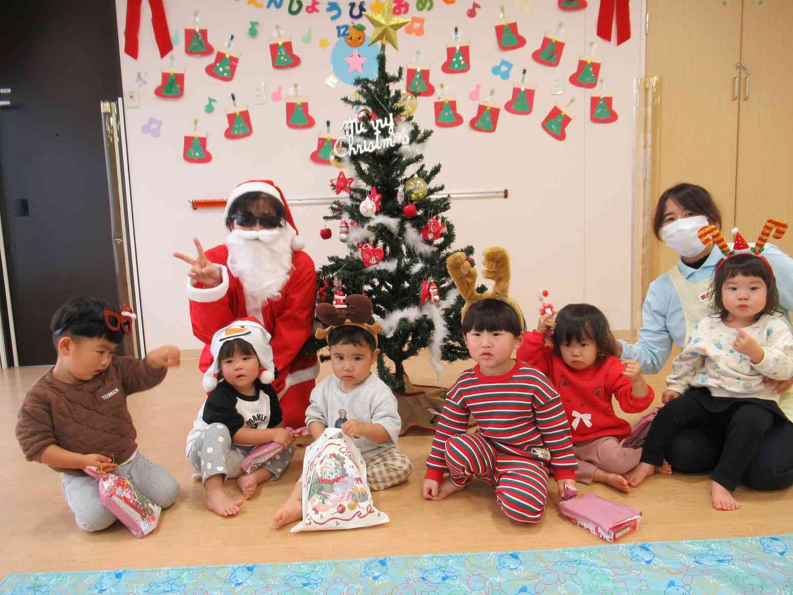 サンタさん登場にひよこ組さんはビックリしちゃいましたが、みんな一人ずつプレゼントを受け取って、最後は記念撮影をしました。