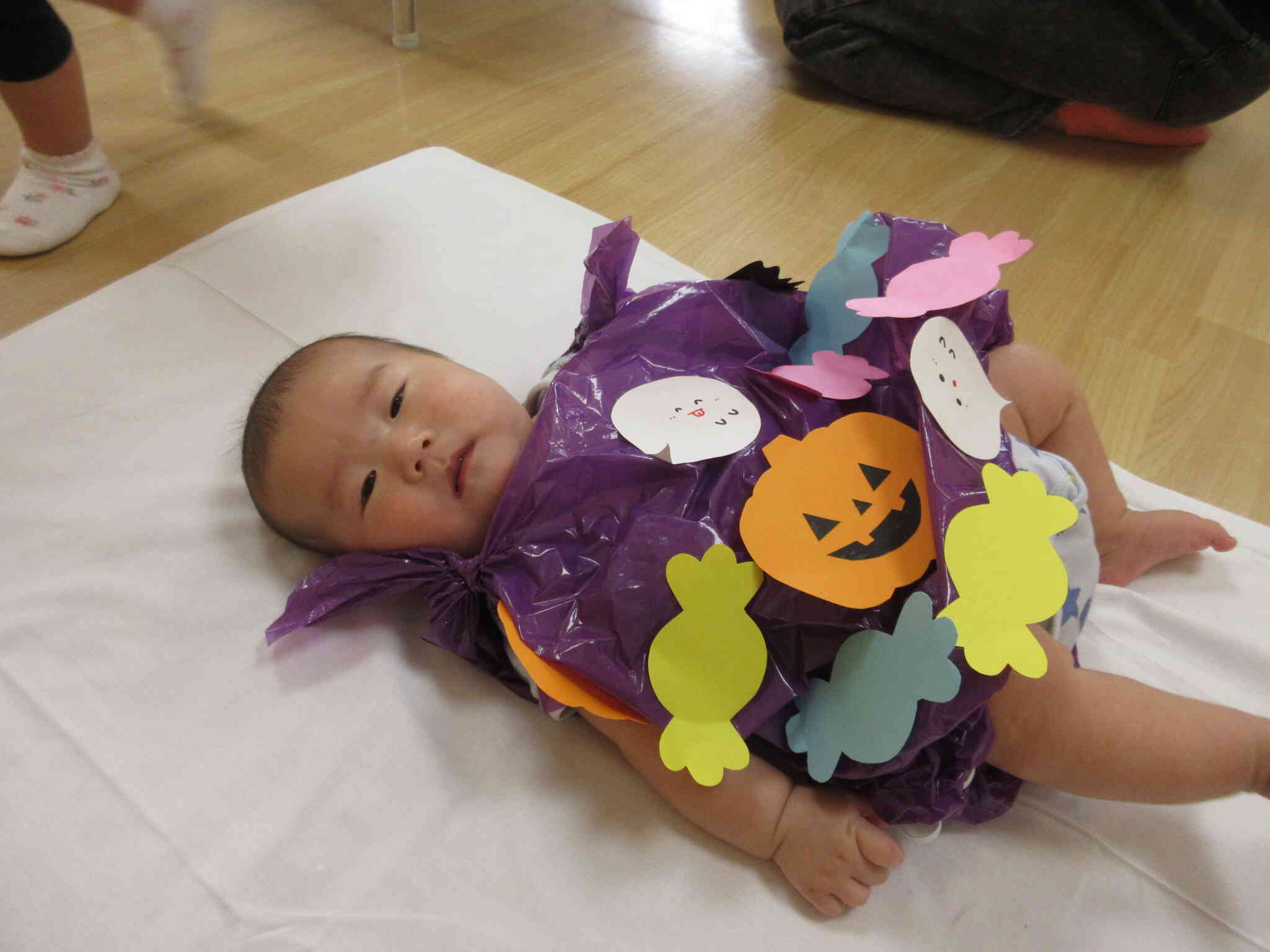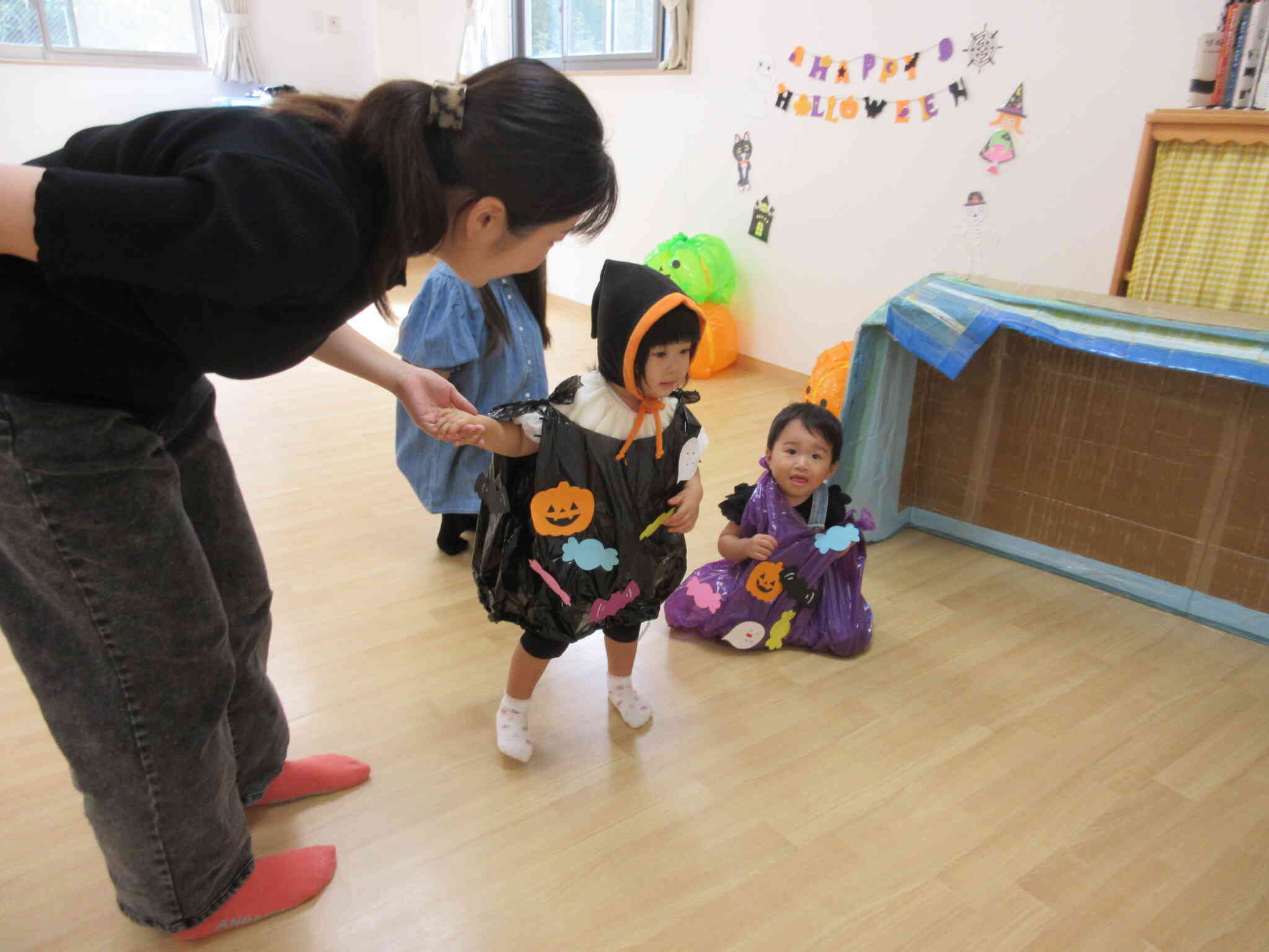 「ハロウィンのかくれんぼ」の絵本では、ハロウィンにちなんだ生き物、食べ物などが出てくるのですが、「保育者のなにかな?」の言葉に「おばけ!」「かぼちゃだ」と元気よく答えてくれ笑顔もたくさん見せてくれました。