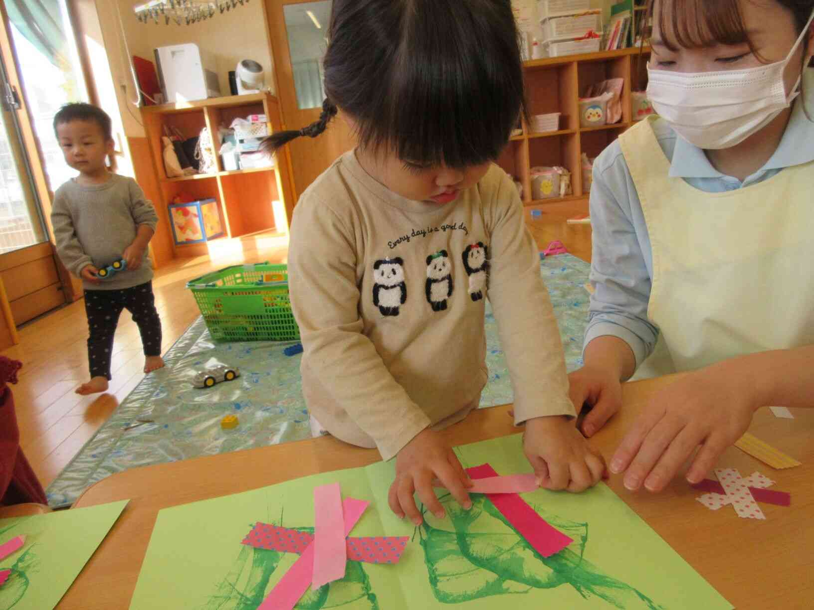 色を付けた糸を画用紙に挟んで、ギューっと引っ張ると