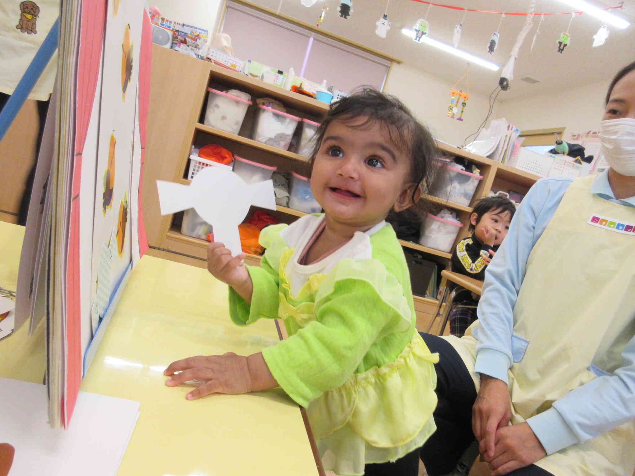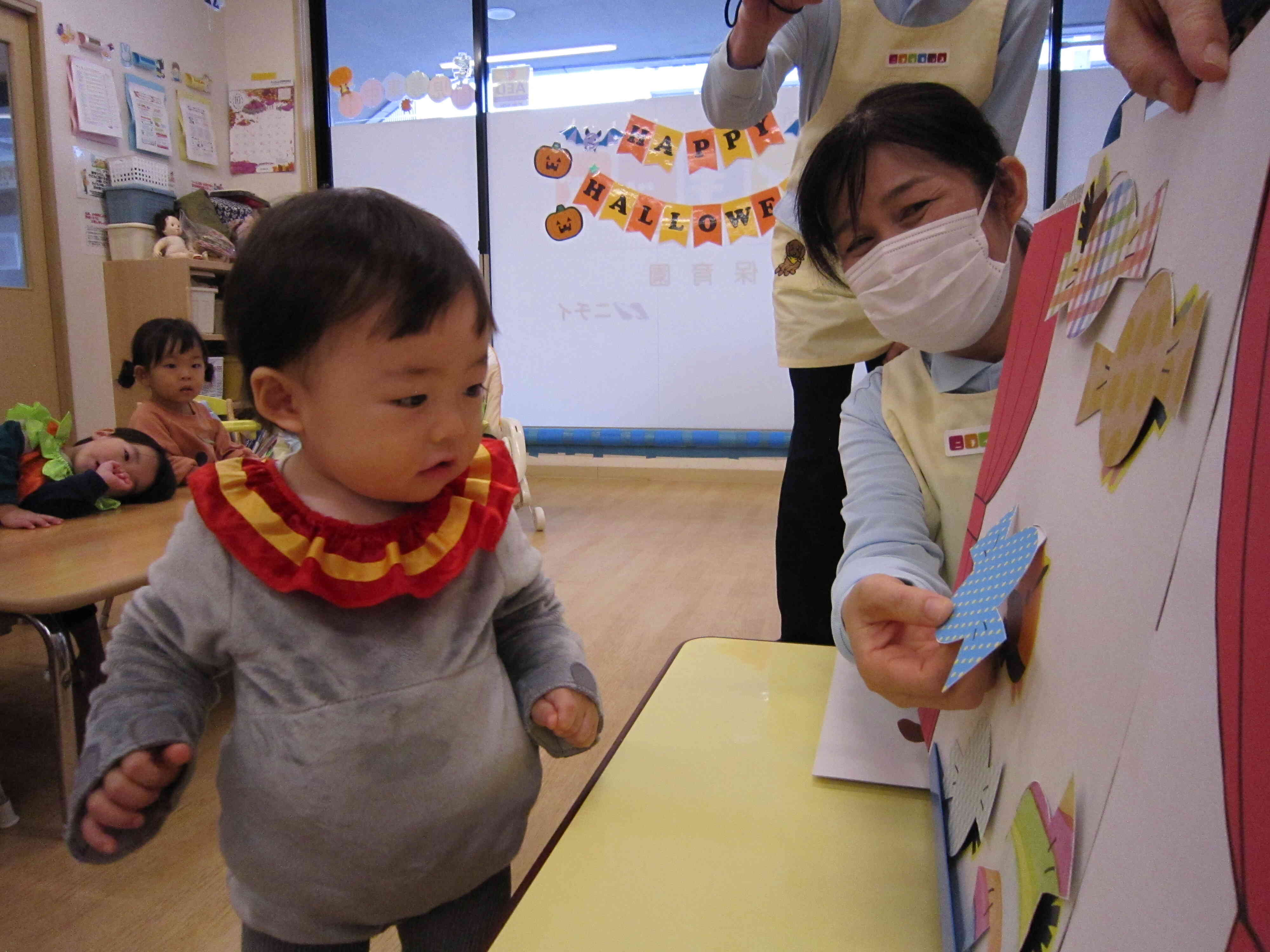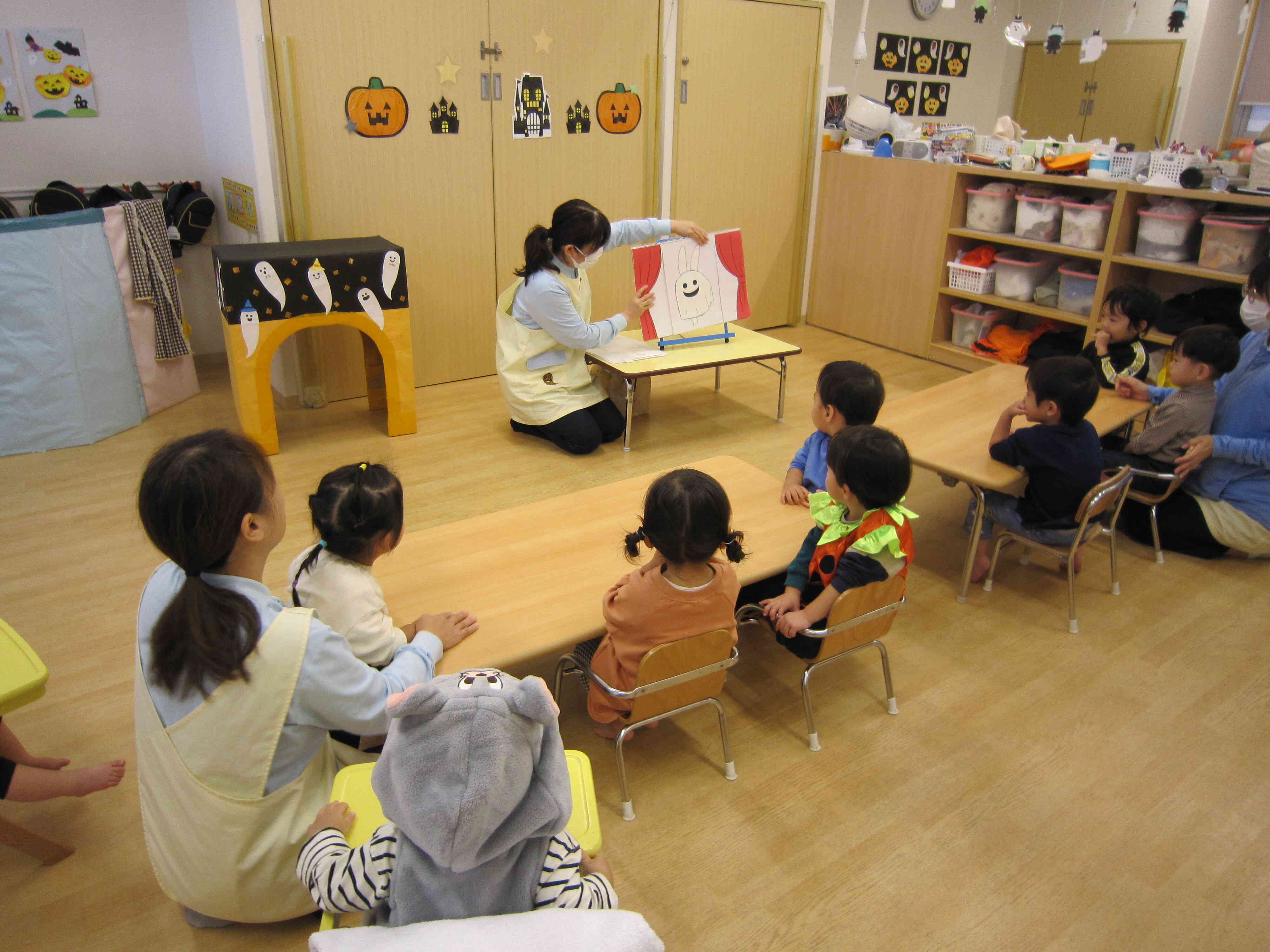 ハロウィンの日には、おばけのお話しのスケッチブックシアターを観たり、お菓子入れバック製作や仮装、魔女探しなどで楽しく過ごしました。