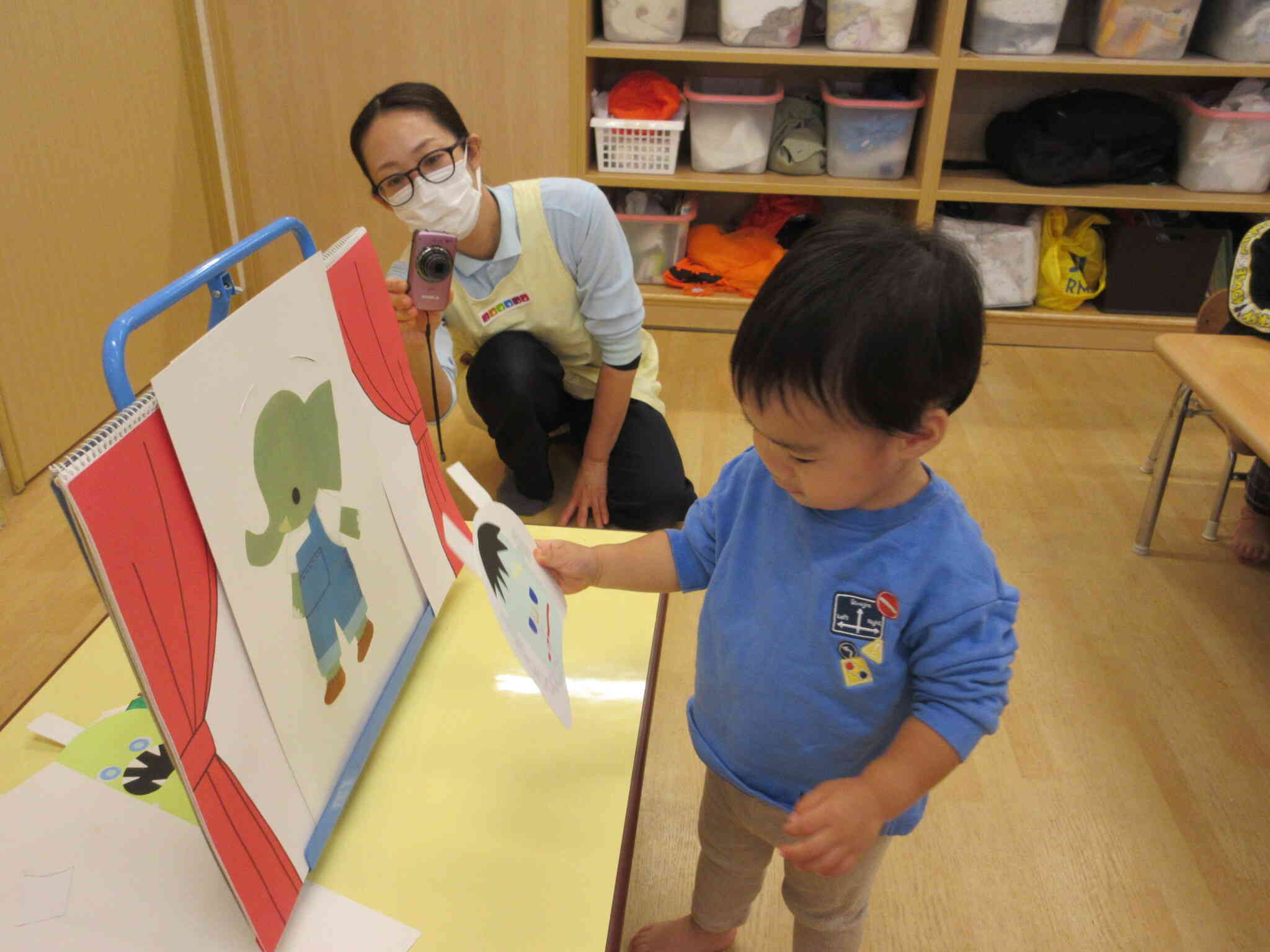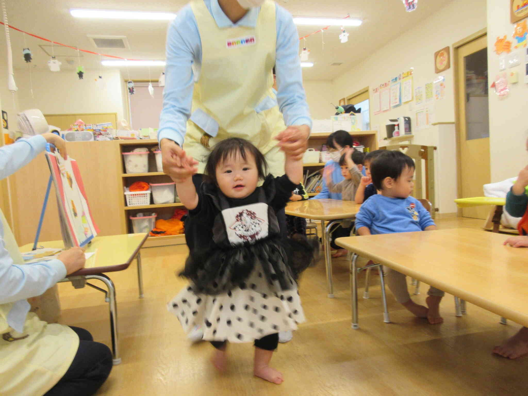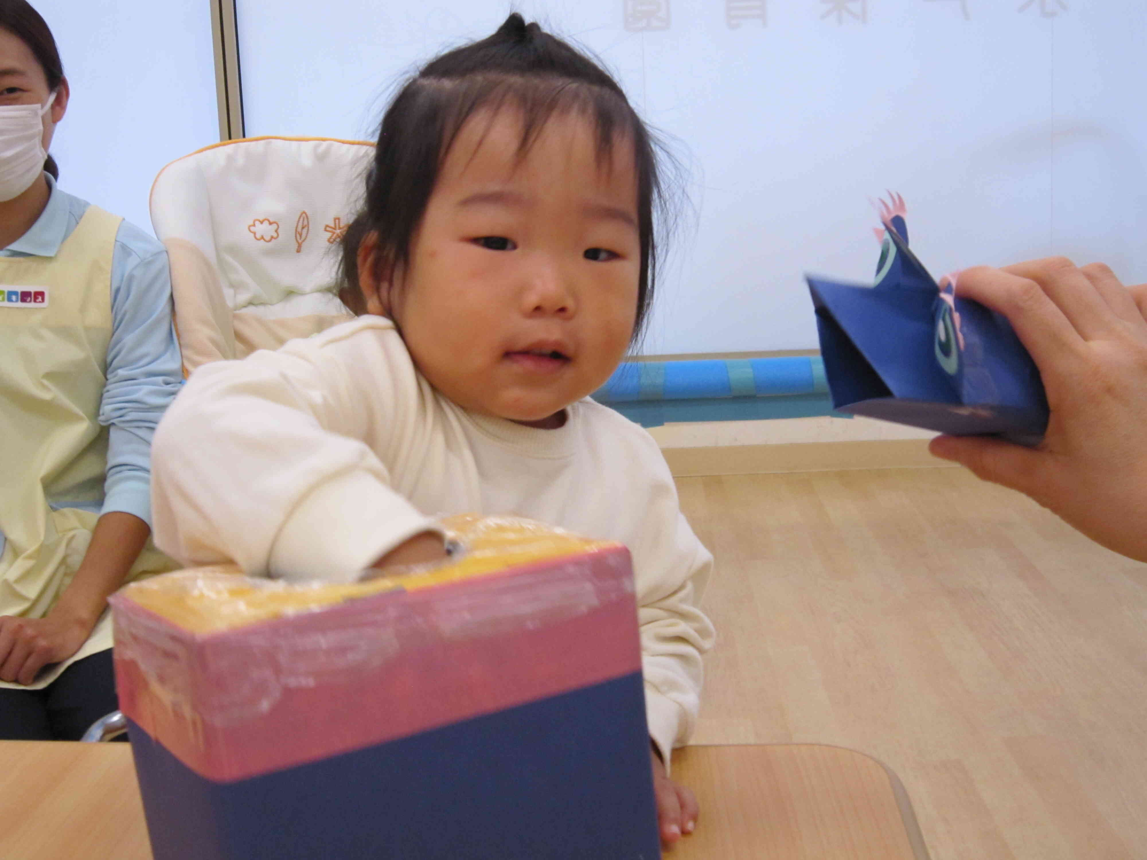 ハロウィンの日には、おばけのお話しのスケッチブックシアターを観たり、お菓子入れバック製作や仮装、魔女探しなどで楽しく過ごしました。