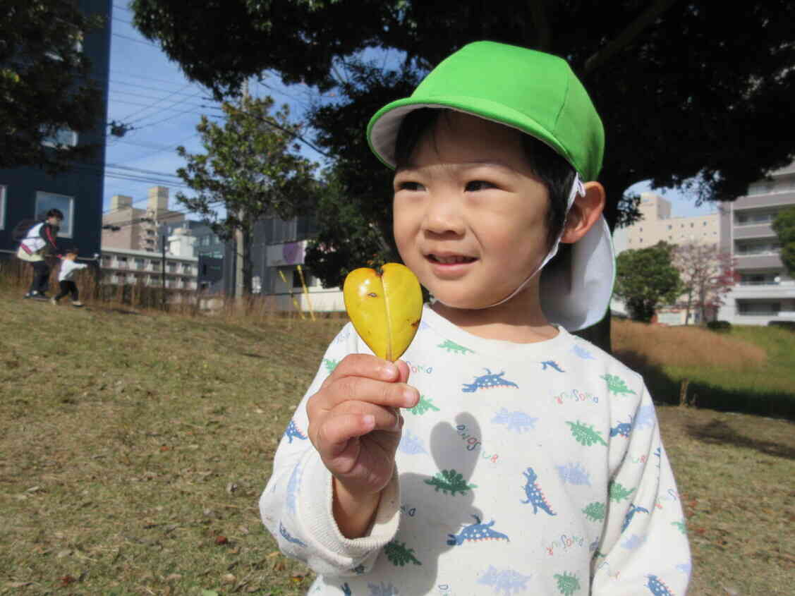 秋は宝物がいっぱい!毎日、気持ちの良い秋晴れの中、公園に向かうとオレンジや黄色に色付いた葉っぱに目を輝かせ、「おみやげ♪」と言って大切そうに拾っているうさぎ組のお友だちです。