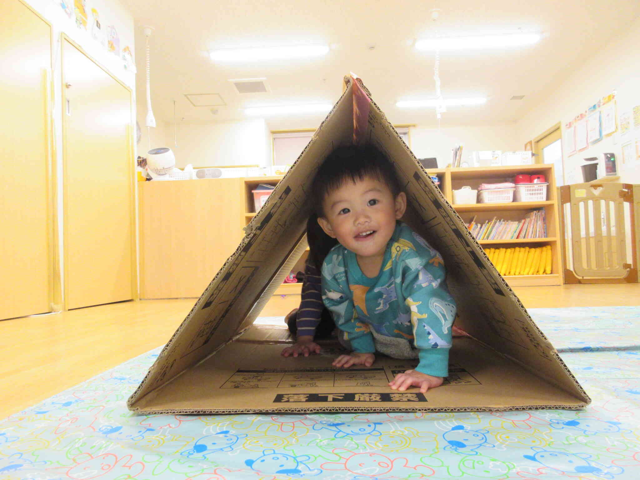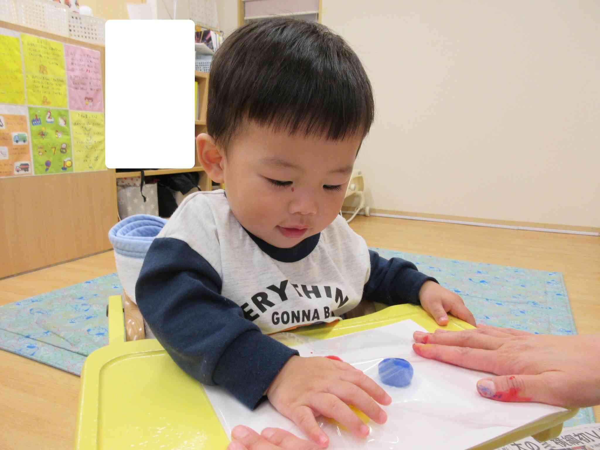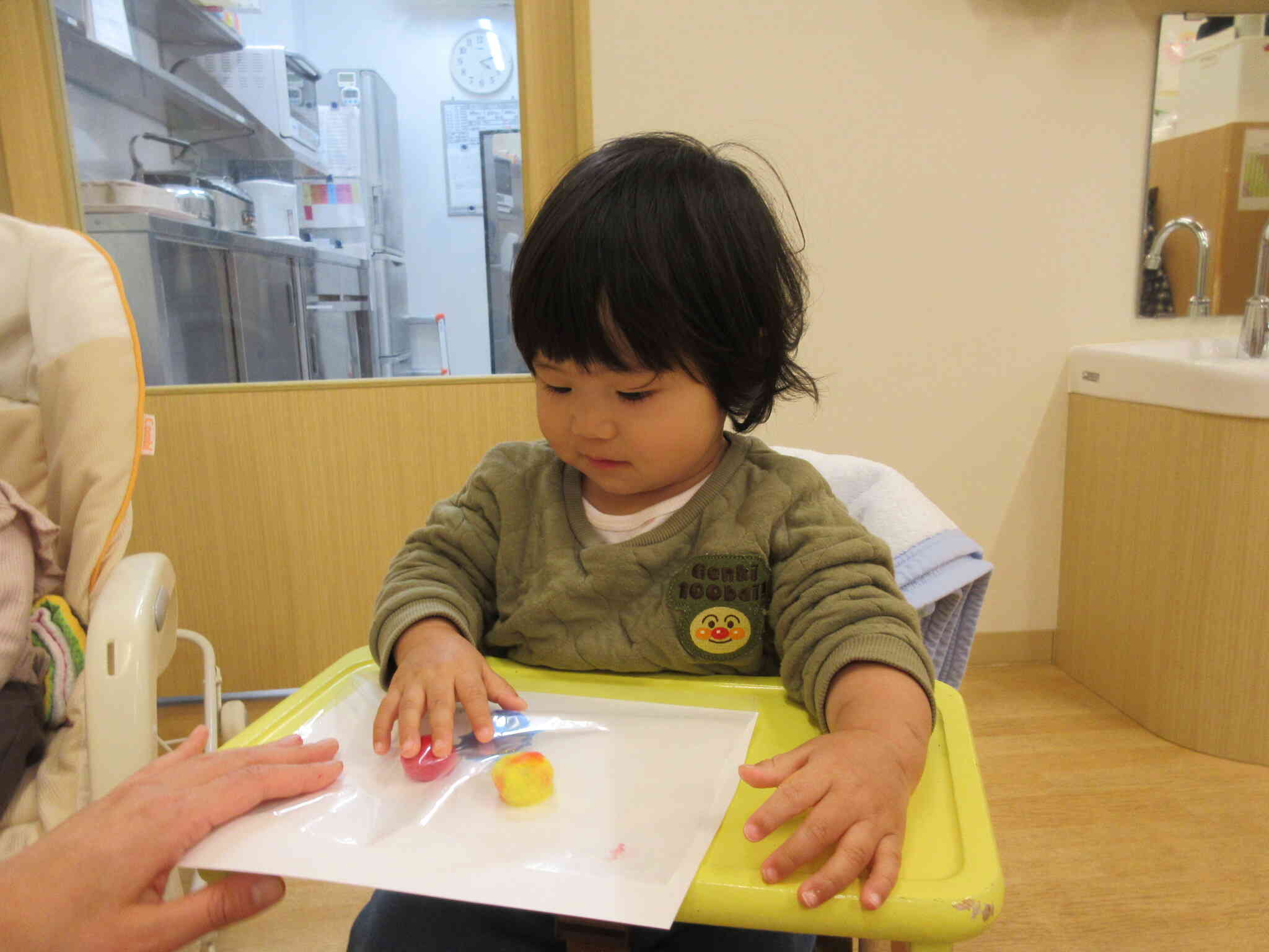 デコレーションボールに絵の具を染み込ませて上から「えい!!」とたたくと…