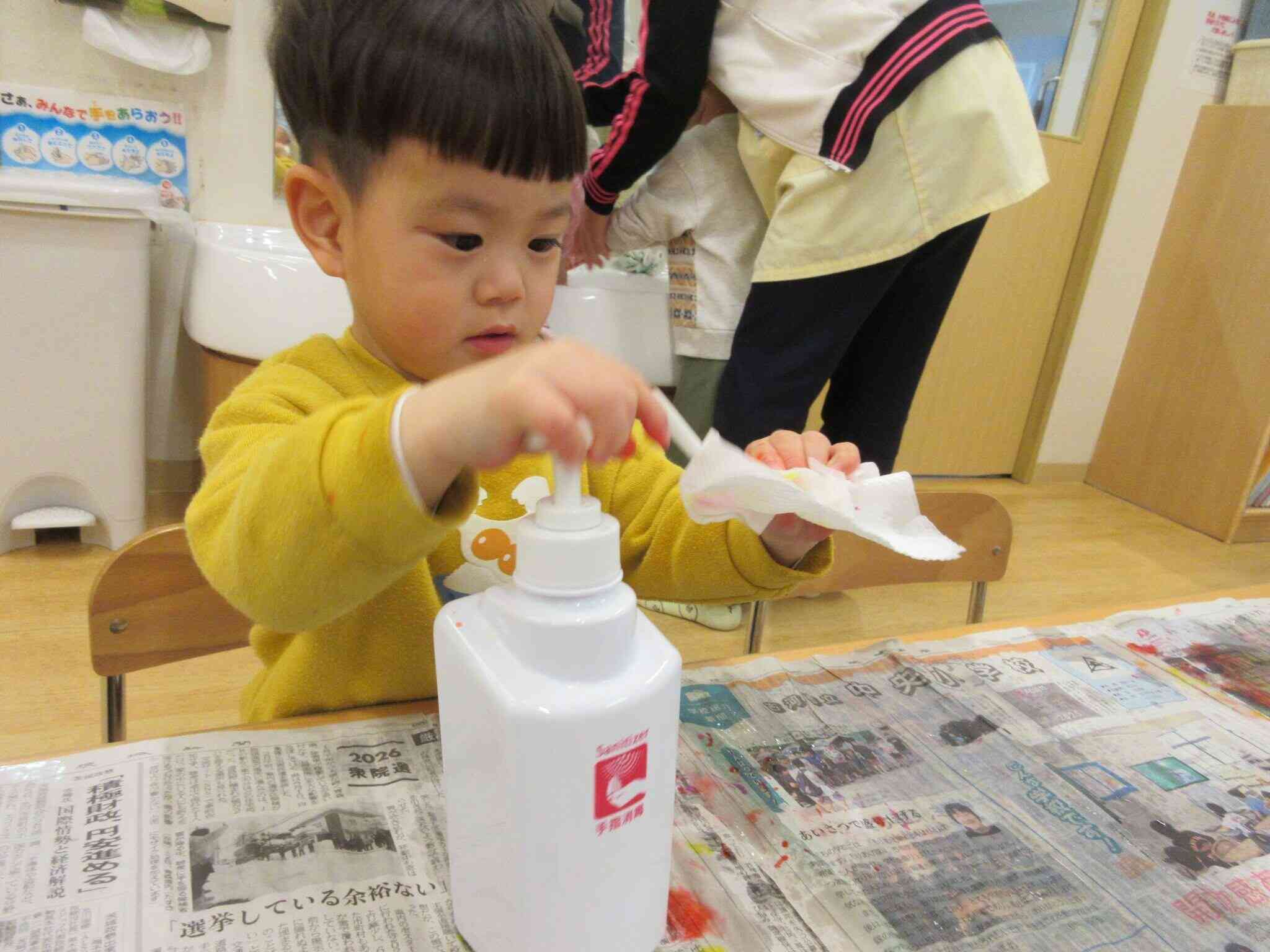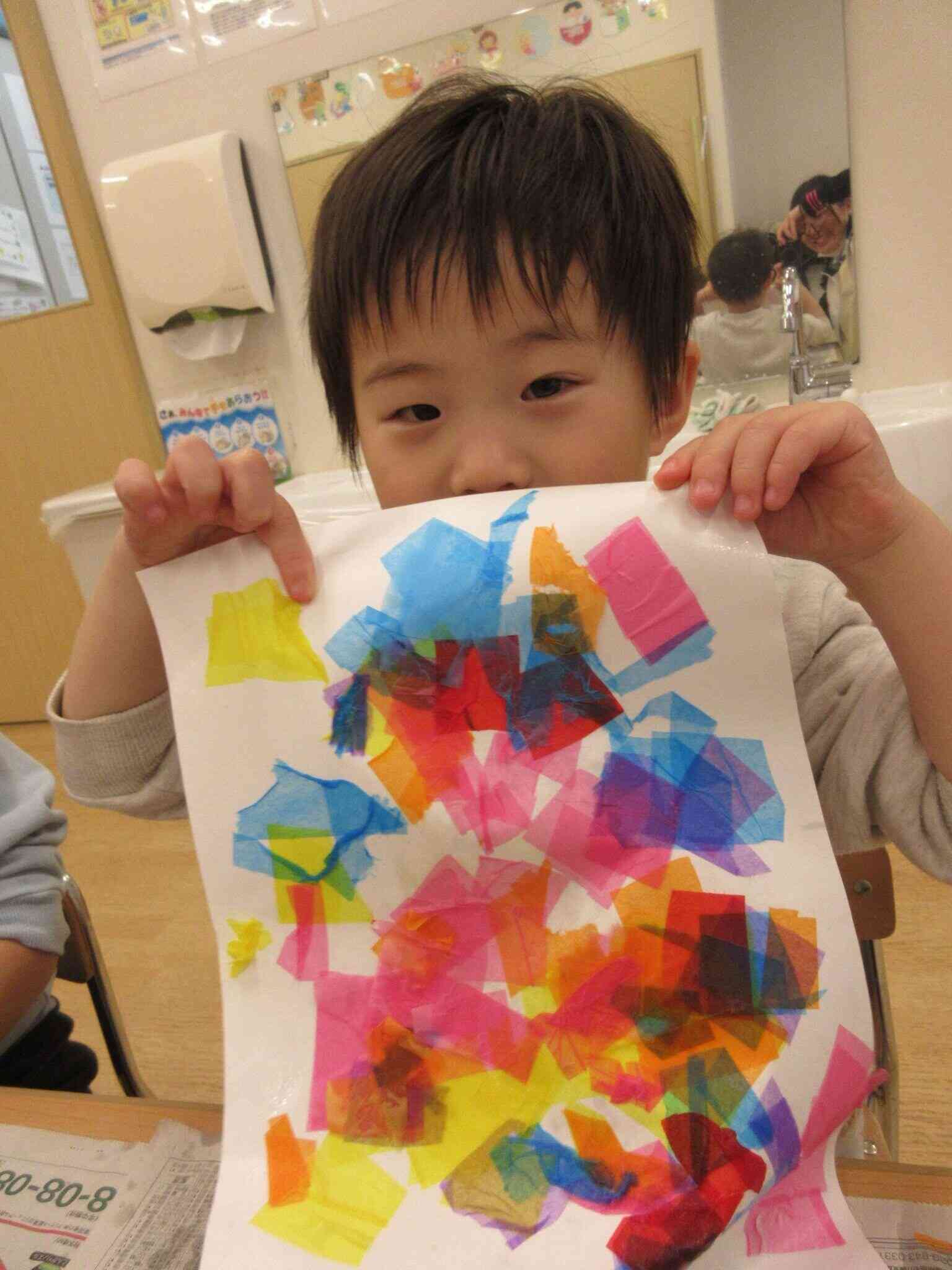 少しだけ水で湿らせた画用紙にカラフルなお花紙をのせて、またその上から水をちょんちょん…。