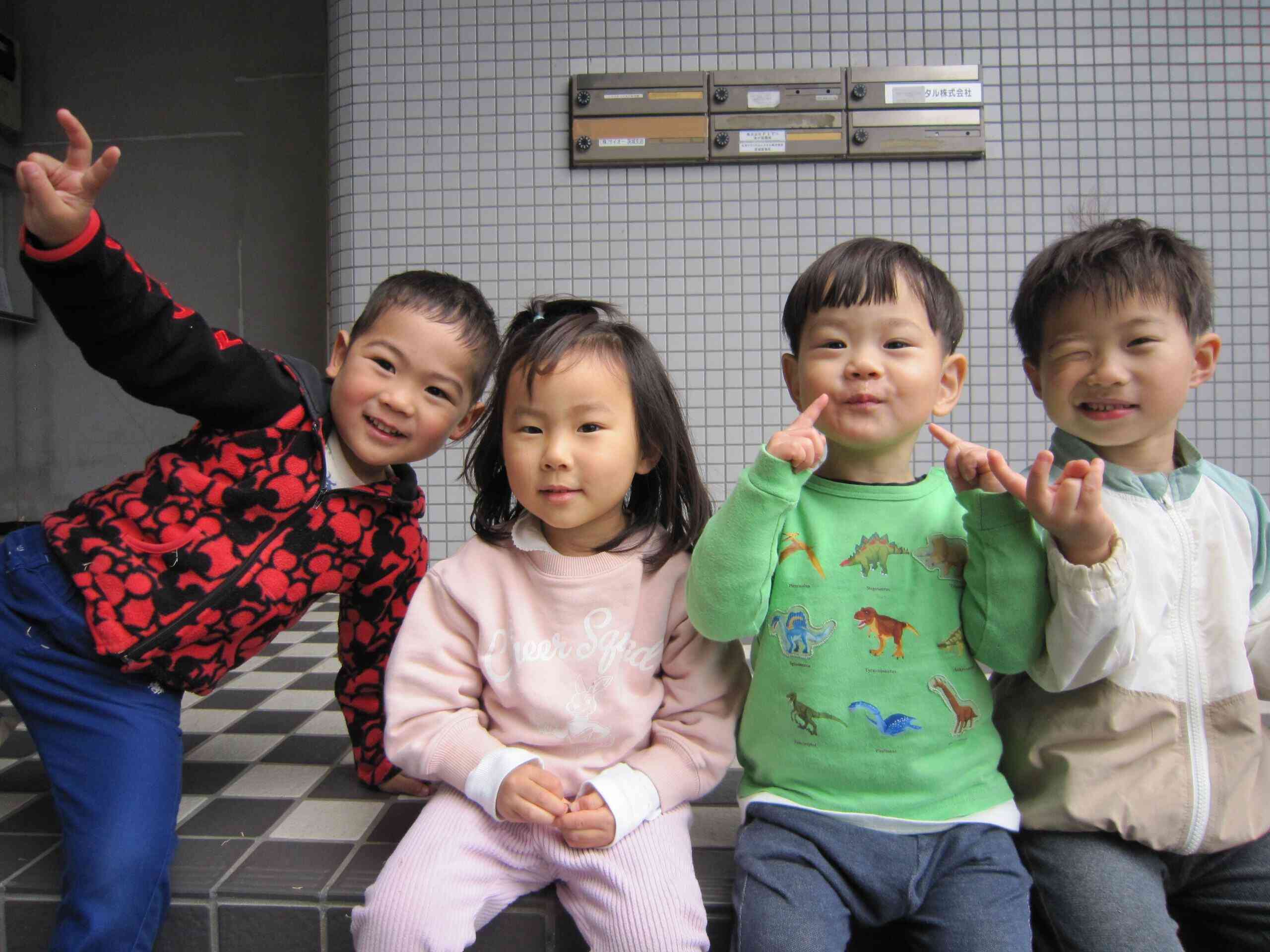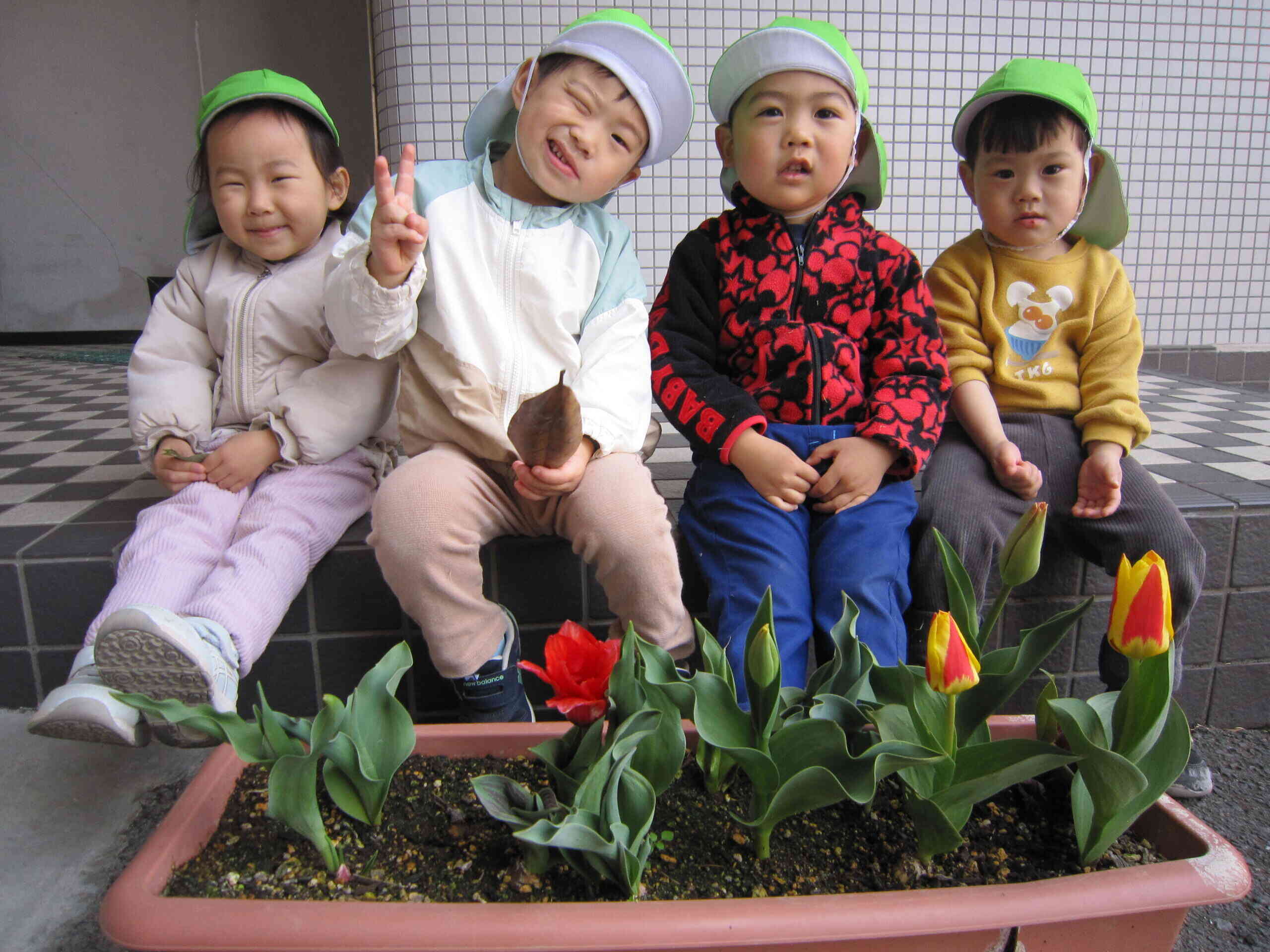 保育園のベランダでは、去年の秋に球根植えを行ったチューリップも元気に花を咲かせみんなでぱしゃり。