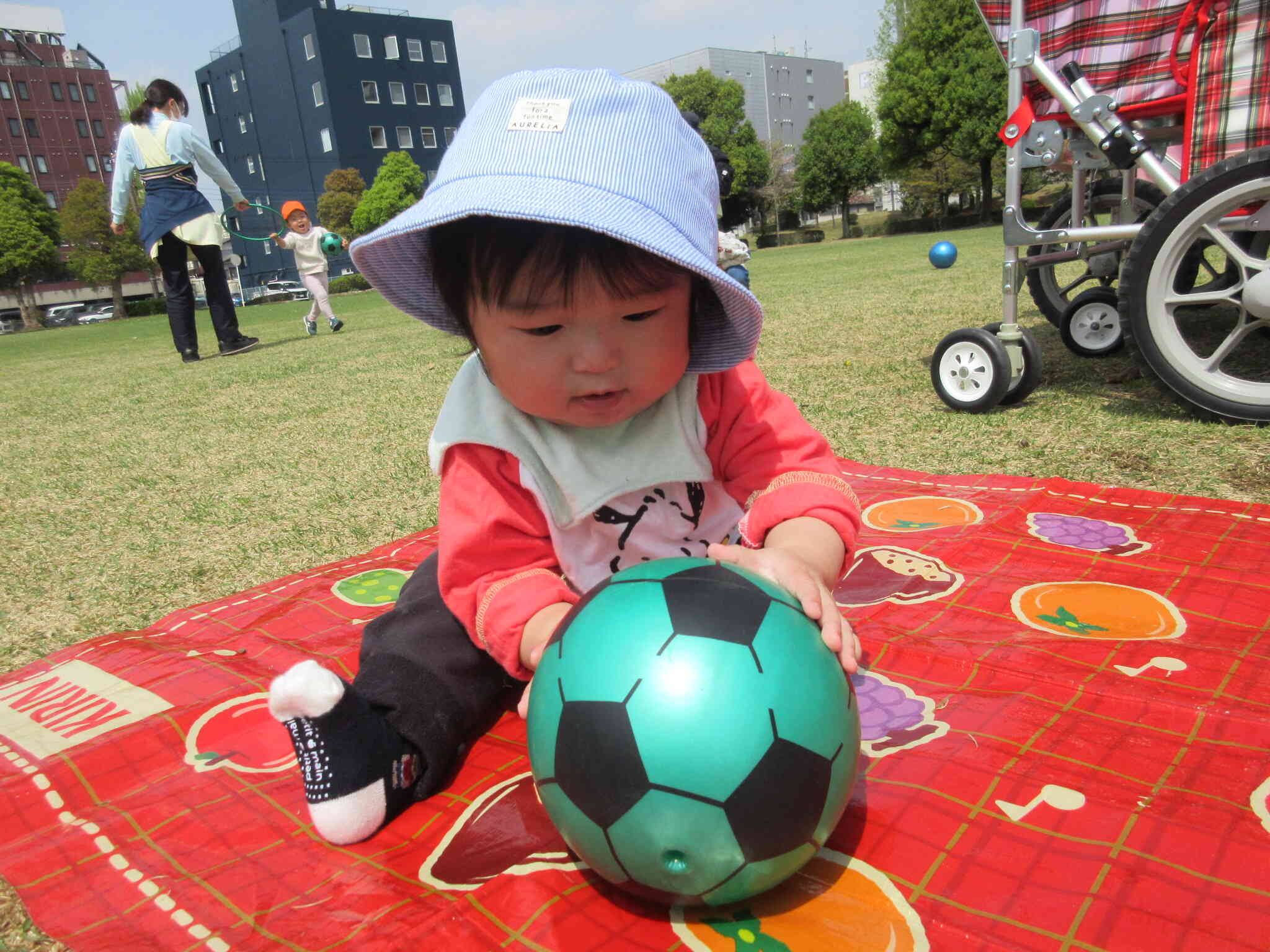 お兄さんが貸してくれたボールに興味津々です!転がるボールを一生懸命に抑える姿が可愛らしいです。