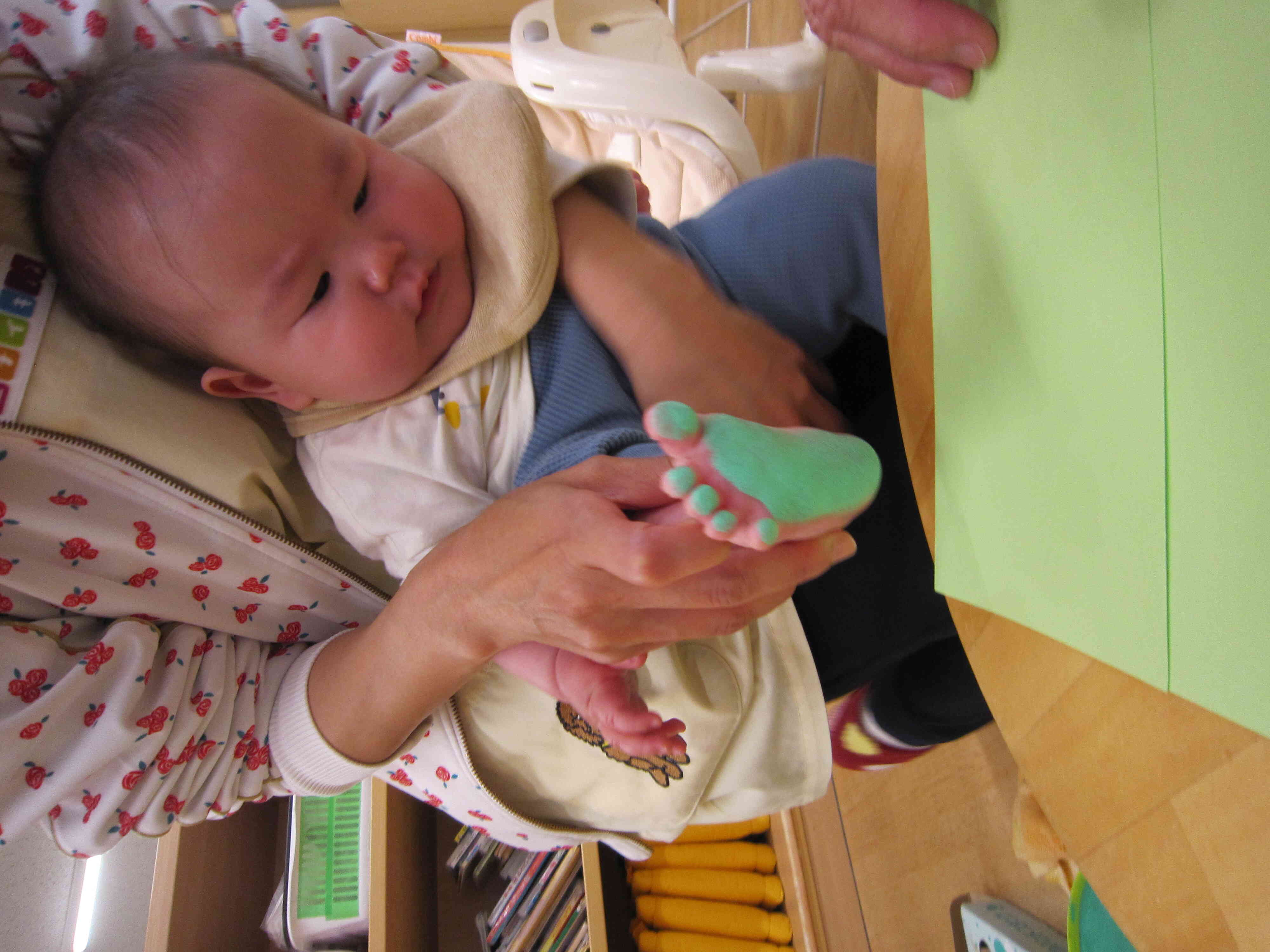 初めての製作活動で手形と足形を取りました。「なんだ?なんだ??」と真剣な表情で取り組んでいました。
