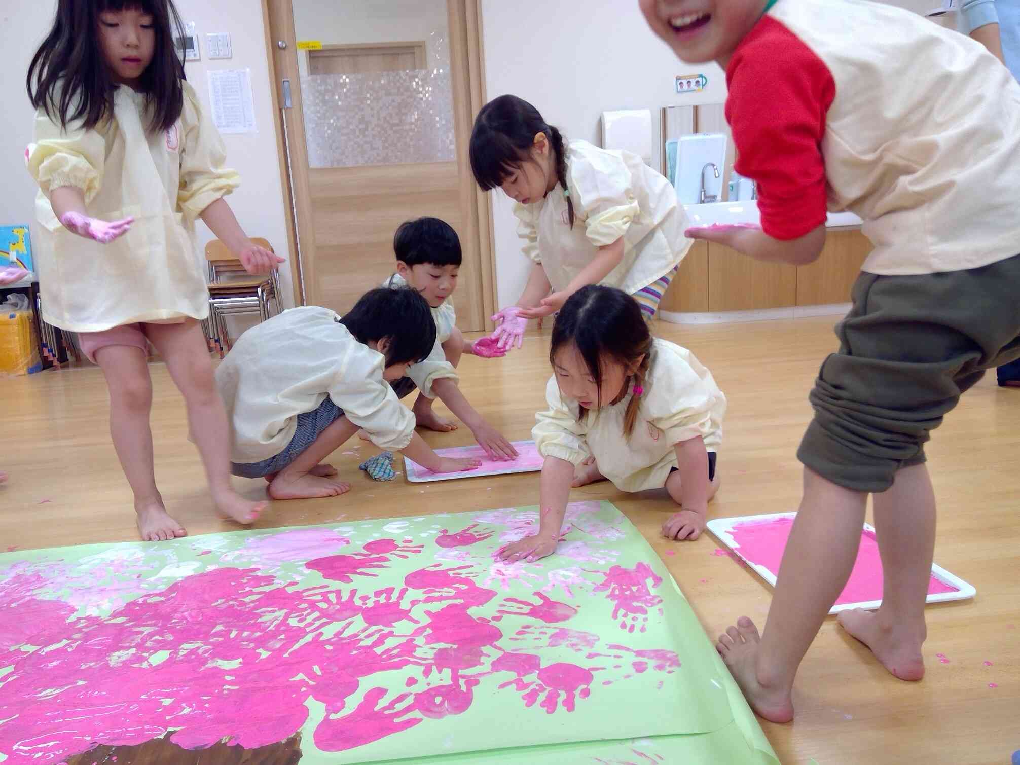 「絵の具でつくろ!」「手で塗る?」と子どもたちのリクエストの技法で行いましたよ。