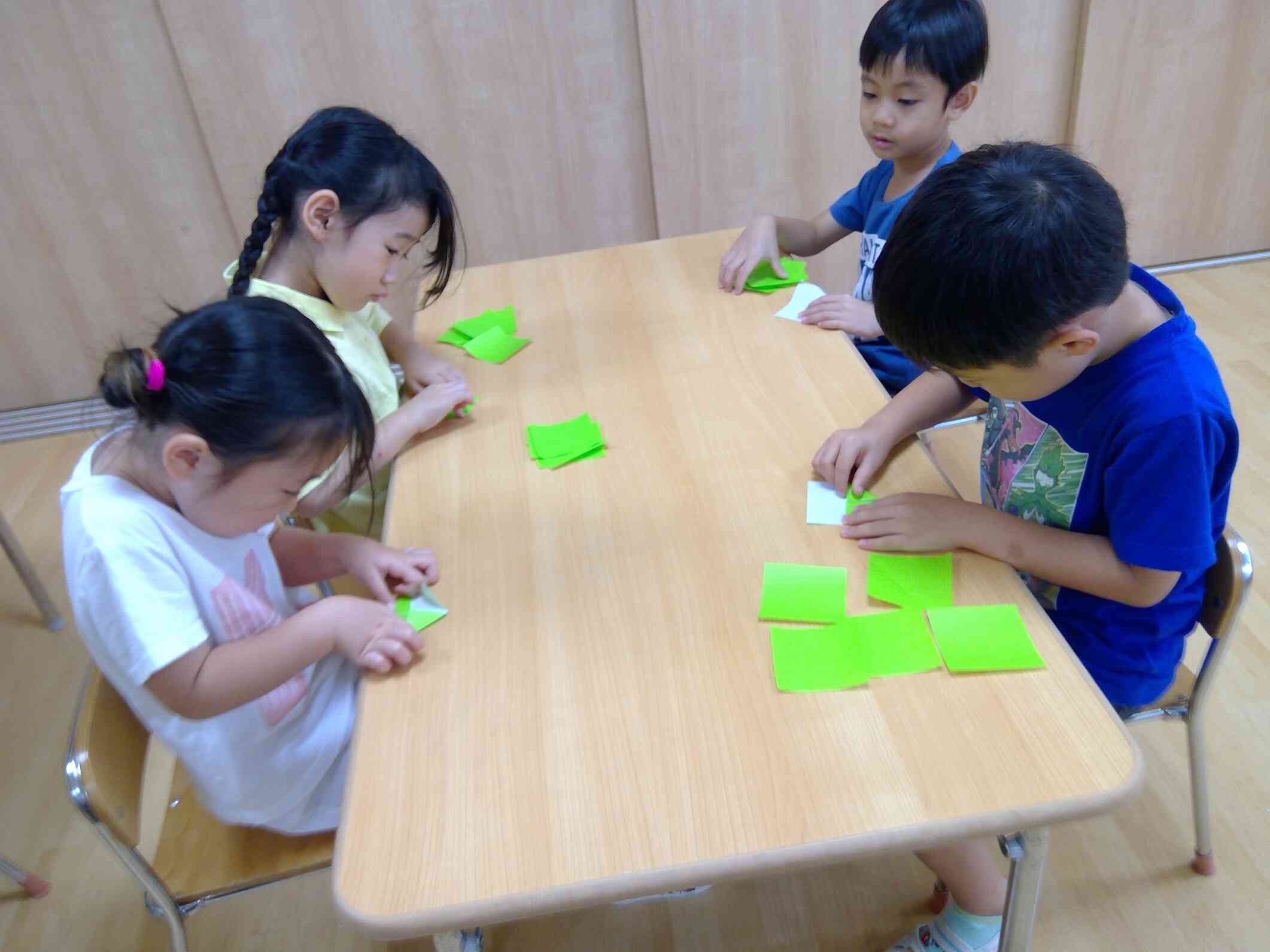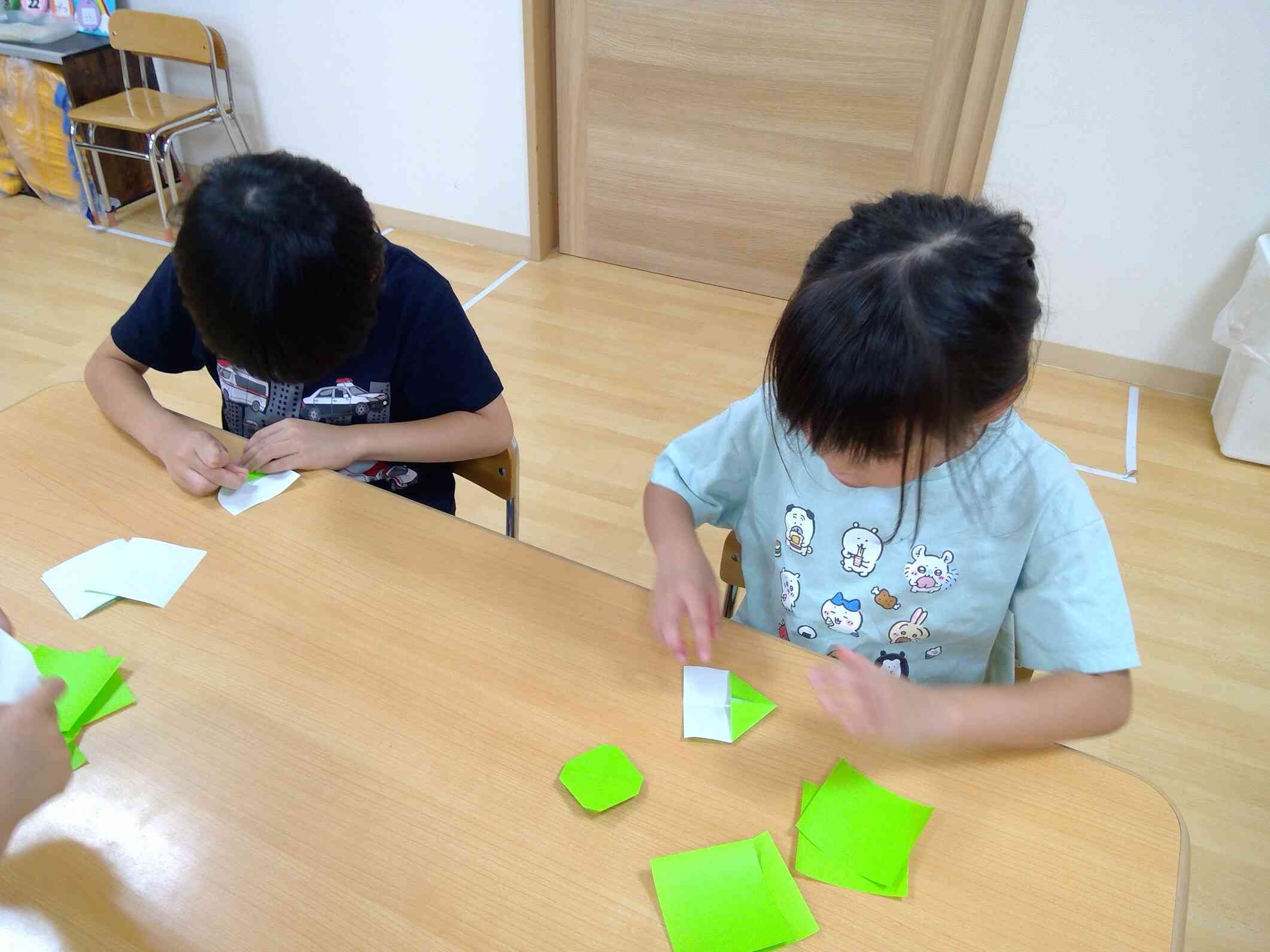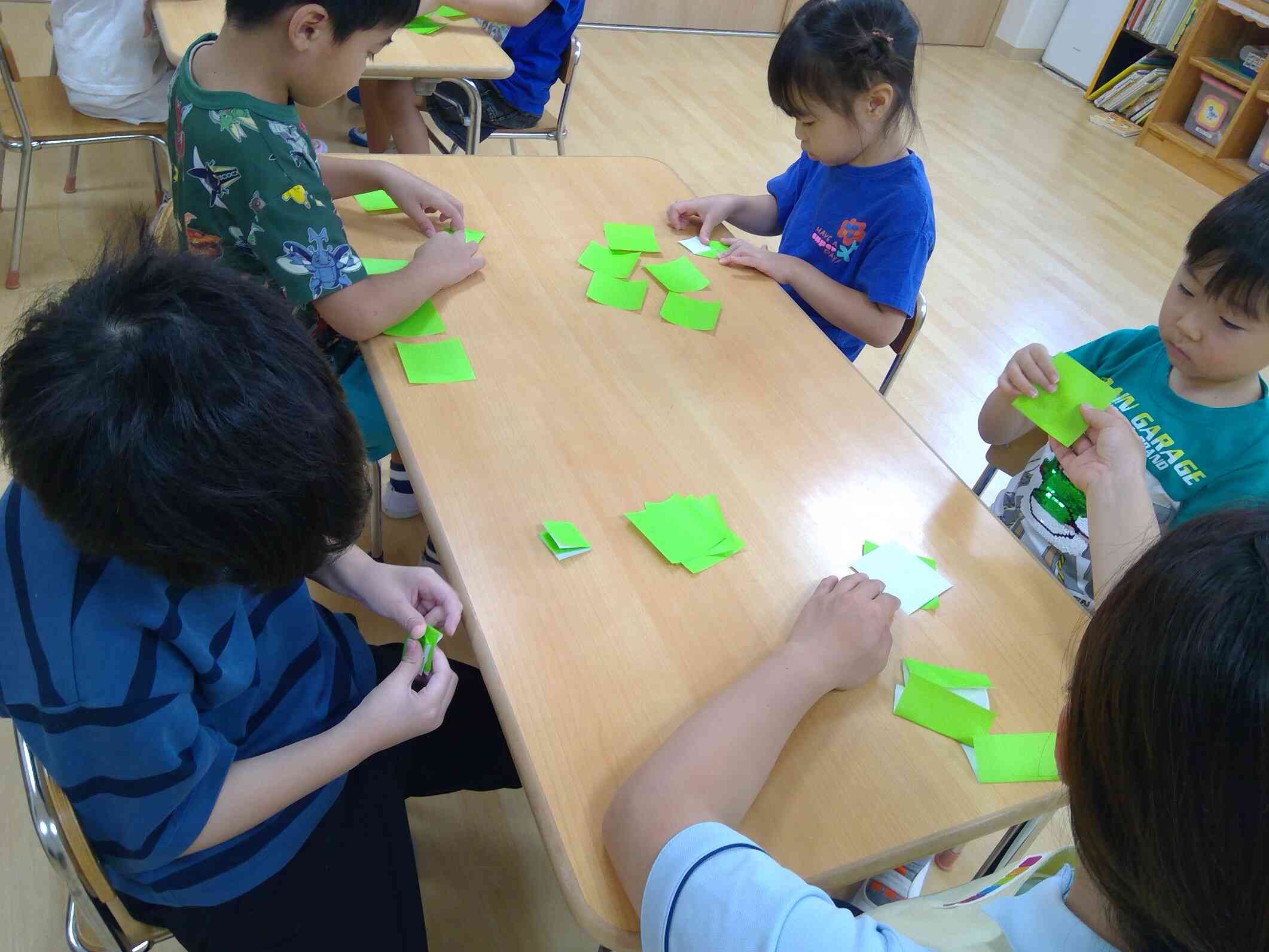 たくさんの折り紙を同じ折り方で折り進めたので、「つかれてきたー」「もう少しで終わりそう…」と言いながら一生懸命取り組んでいましたよ。